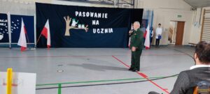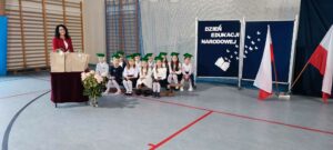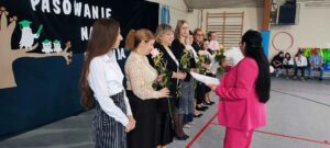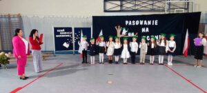 W tym dniu do grona braci uczniowskiej zostali przyjęci uczniowie klasy I, którzy złożyli uroczyste ślubowanie i zostali pasowani na ucznia. Pierwszoklasiści zaprezentowali się w ciekawym programie artystycznym przygotowanym pod kierunkiem wychowawczyni pani Beaty Mrotek. Miłą niespodziankę przygotowała dla nich również klasa III: samodzielnie wykonane zakładki do książek.