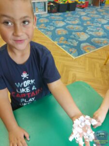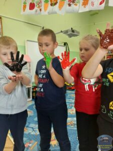 Na początku przedszkolaki rozmawiały na temat zarazków, bakterii i wirusów które „zamieszkują” nasze ręce. Omówiliśmy też schemat dokładnego mycia rąk i zastosowaliśmy go w praktyce. Dzieci bawiły się również przy piosenkach pt. „Umyć ręce”, „Piosenka o brudasie i czyściochu”, „Mydło lubi zabawę” oraz oglądały filmy edukacyjne. Wykonywały eksperymenty pt. „Do czego potrzebne jest mydło?” i „Jak ważne jest wycieranie rąk” po czym doszły do wniosku, że brud boi się mydła i że po każdorazowym umyciu rąk, należy je wytrzeć do sucha czystym ręcznikiem.