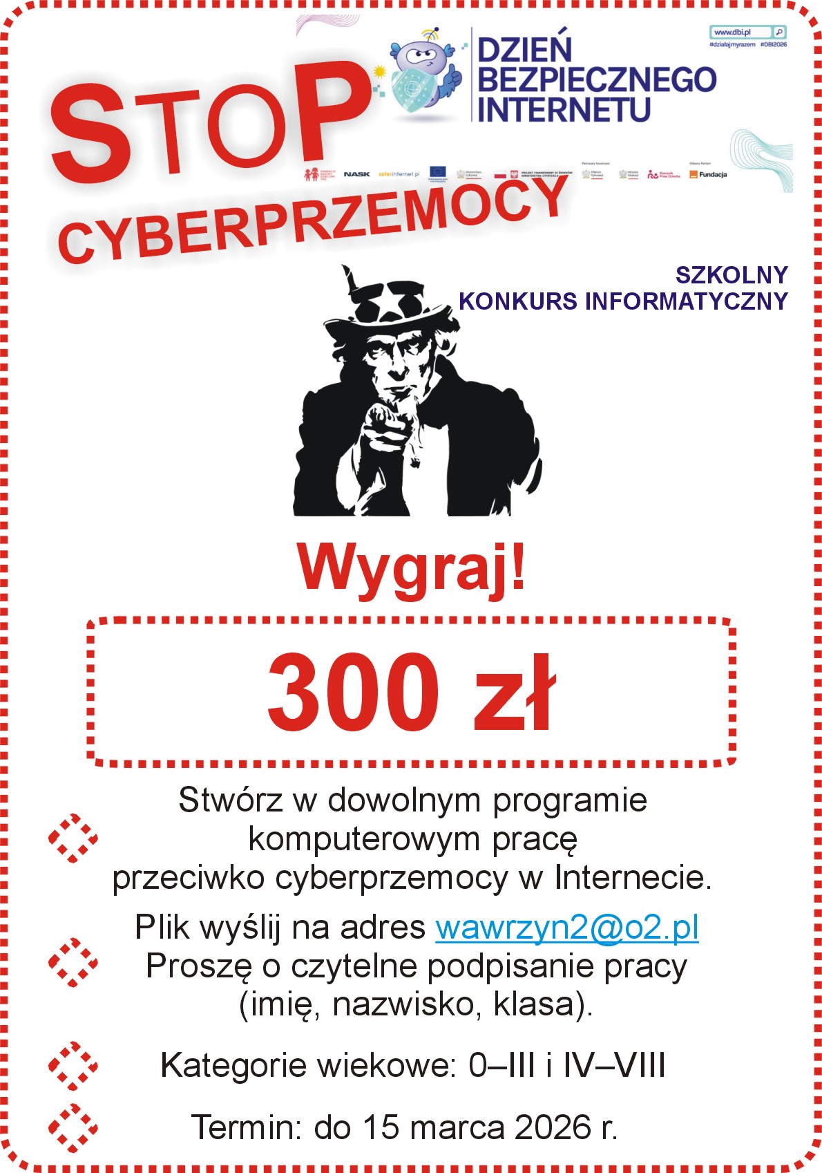 Stwórz w dowolnym programie komputerowym pracę promującą walkę z cyberprzemocą i zasady kultury w sieci. Pokażmy, że potrafimy dbać o siebie nawzajem w cyfrowym świecie!