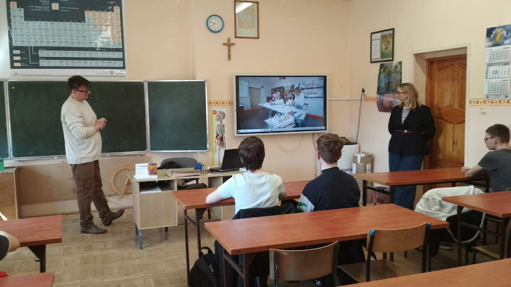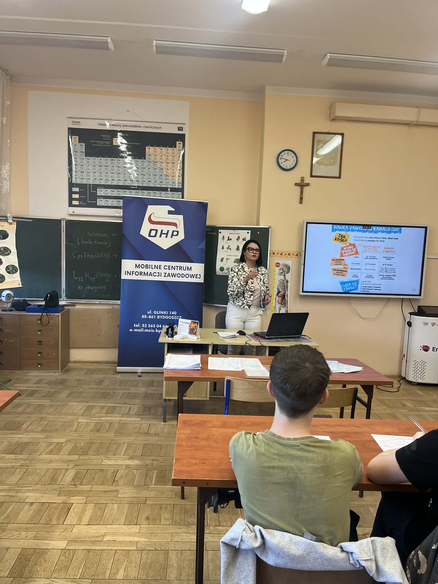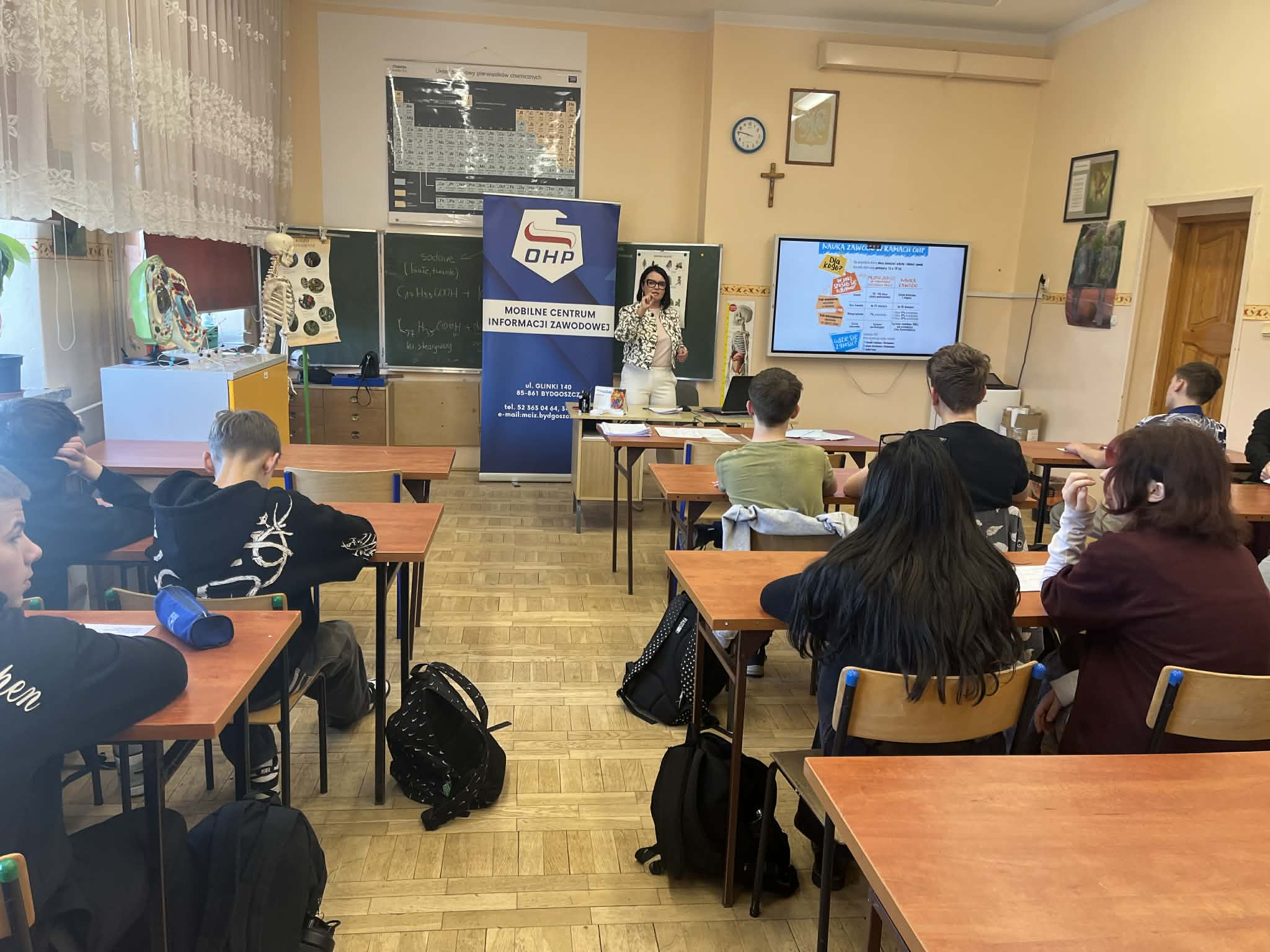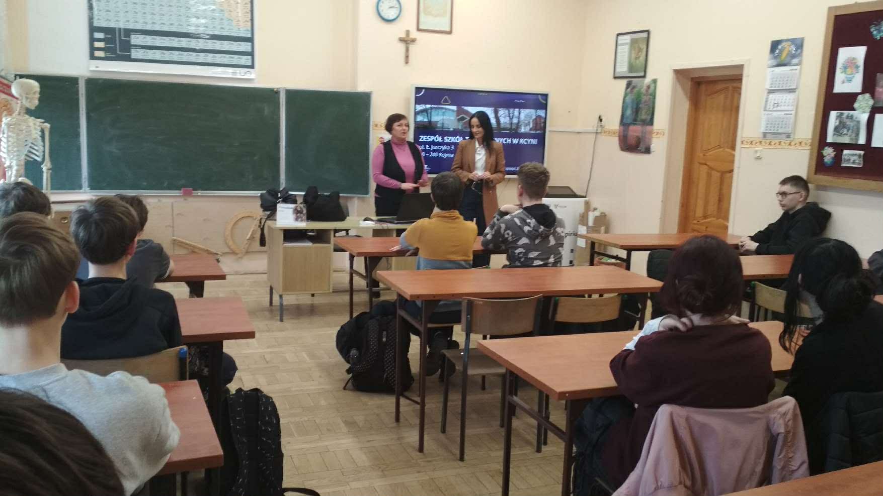 Dodatkowo zorganizowano spotkanie ze starszą doradczynią zawodową z Centrum Edukacji i Pracy Młodzieży w Bydgoszczy, Sylwią Tomaszewską, która przedstawiła zasady planowania ścieżki edukacyjnej i zawodowej.