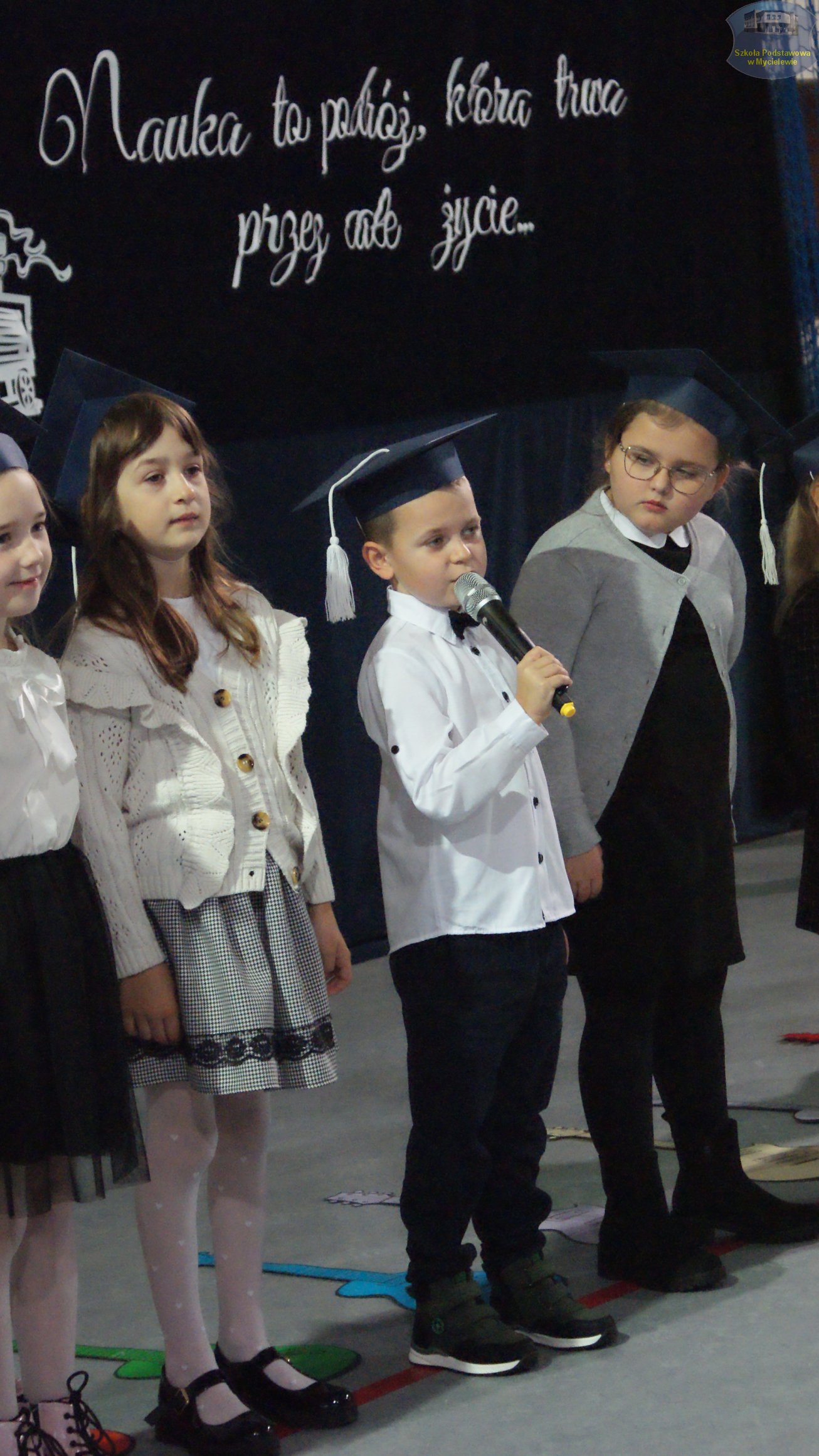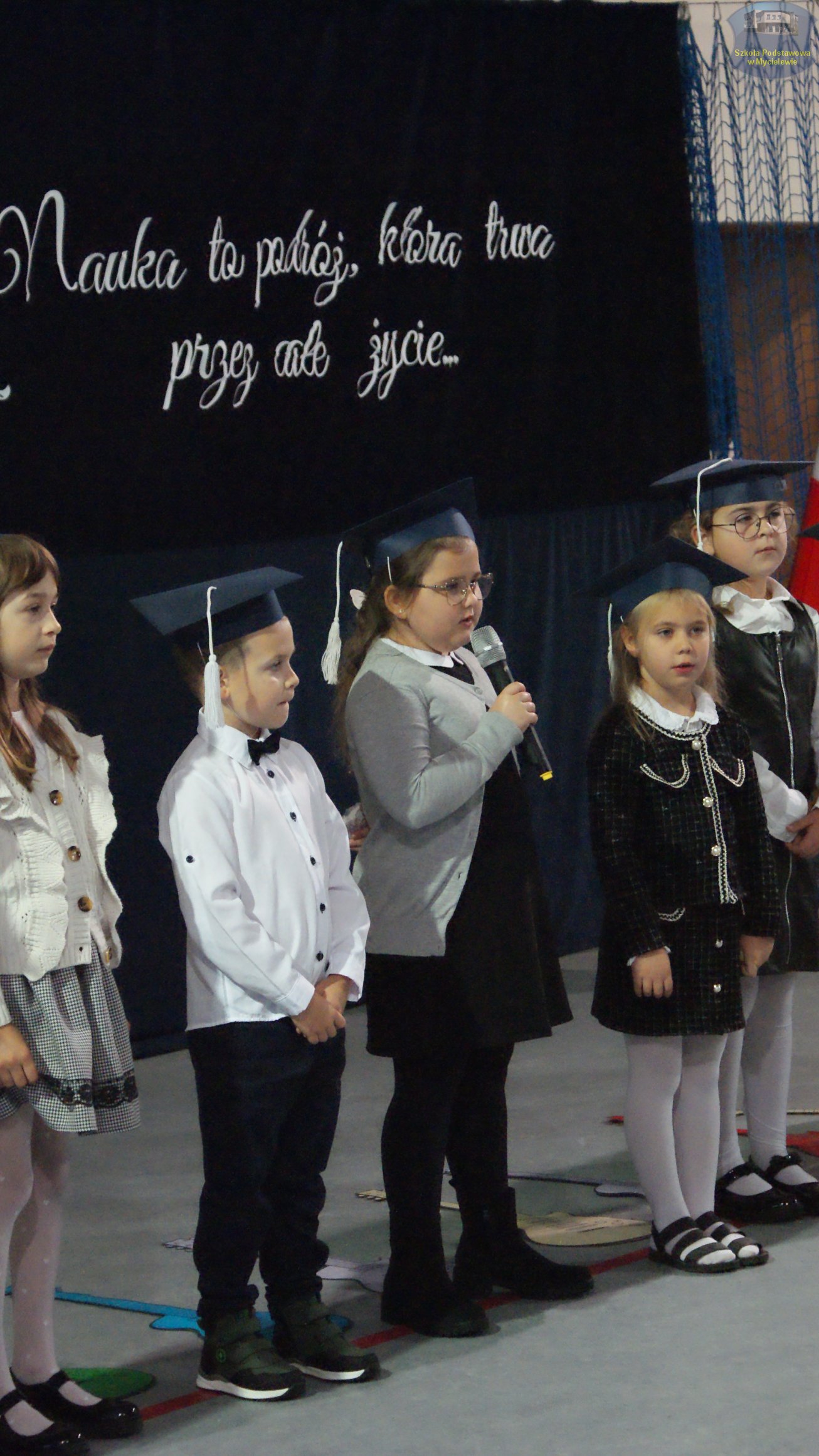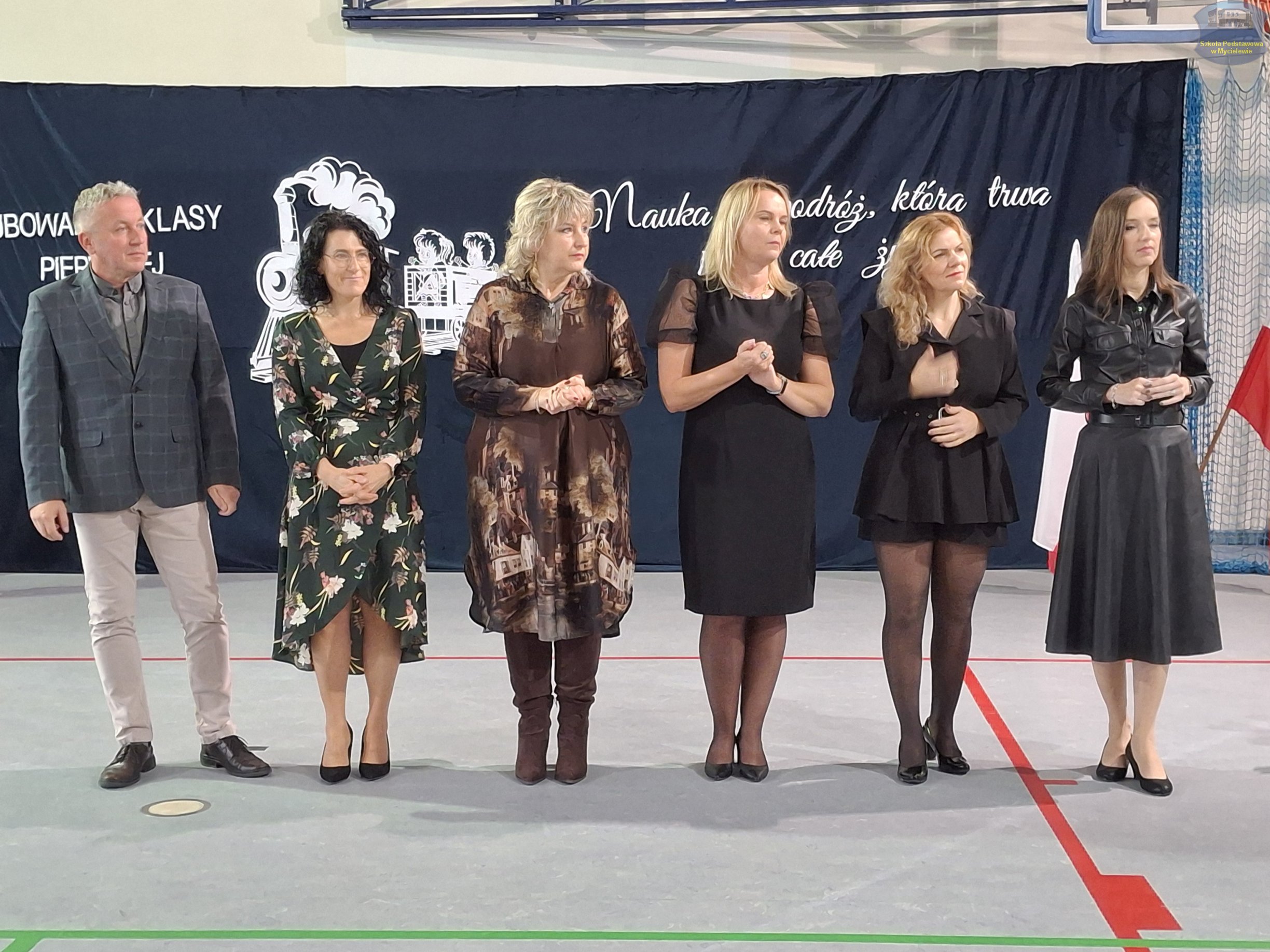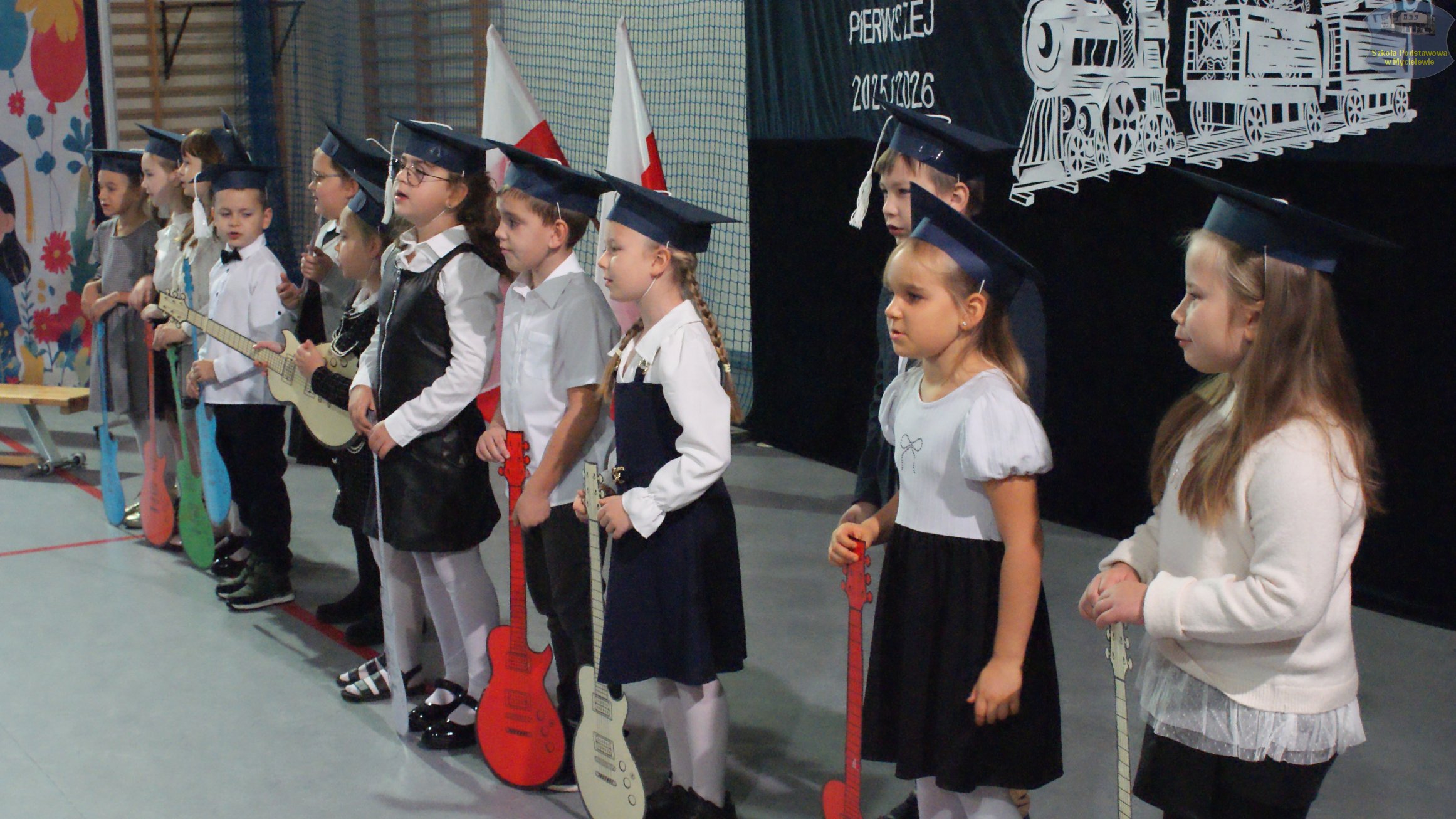 Pierwsza część uroczystości należała do naszych pierwszoklasistów, którzy z wielkim przejęciem, ale i dumą, przystąpili do ceremonii Pasowania na Ucznia. W pięknie udekorowanej sali gimnastycznej rozbrzmiewały piosenki i słowa recytowanych ról z przygotowanego scenariusza pt. „Podróż w Pierwszej Klasie”. Mali artyści z zaangażowaniem udowadniali, że są gotowi, aby dołączyć do szkolnej społeczności.