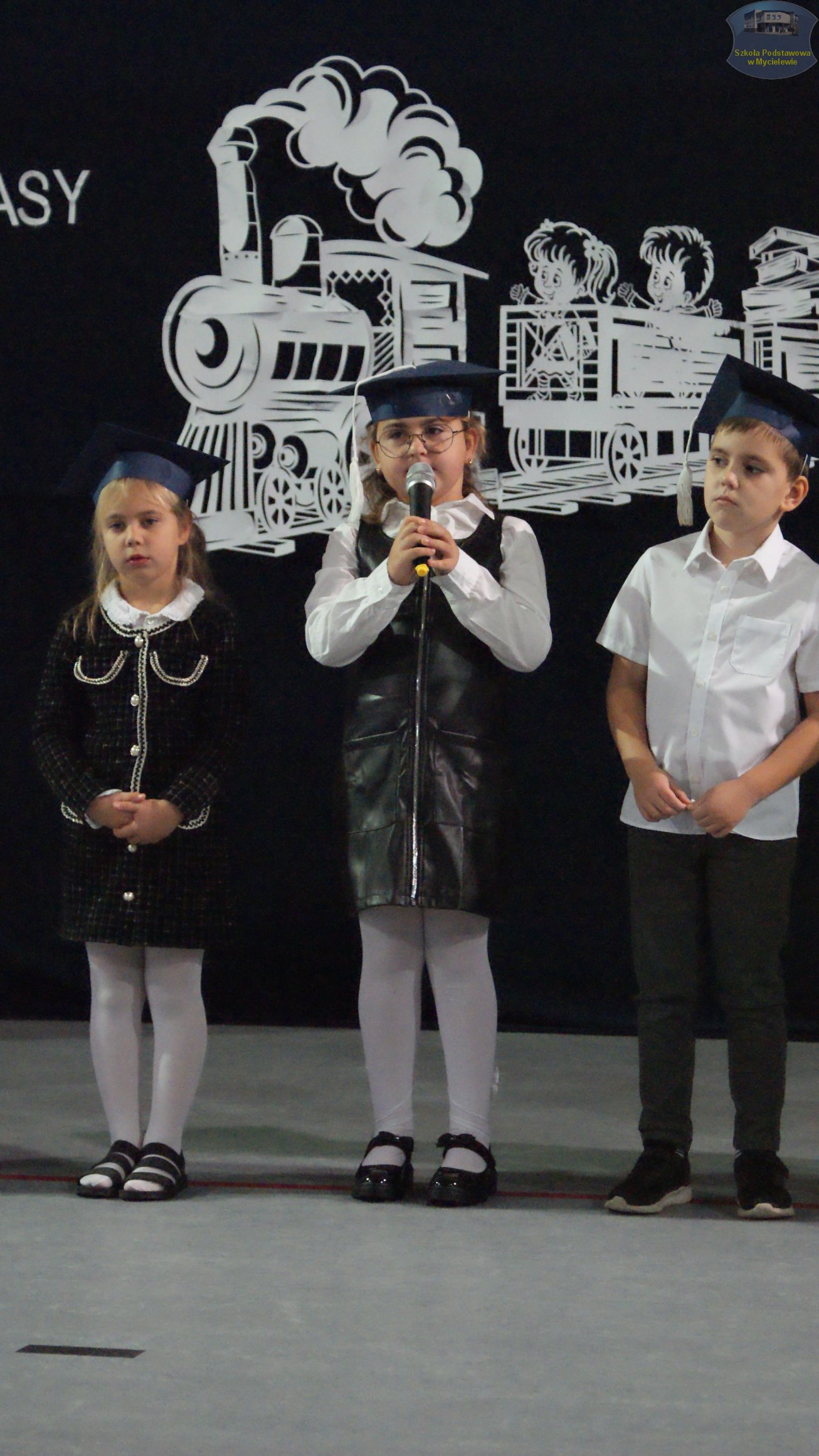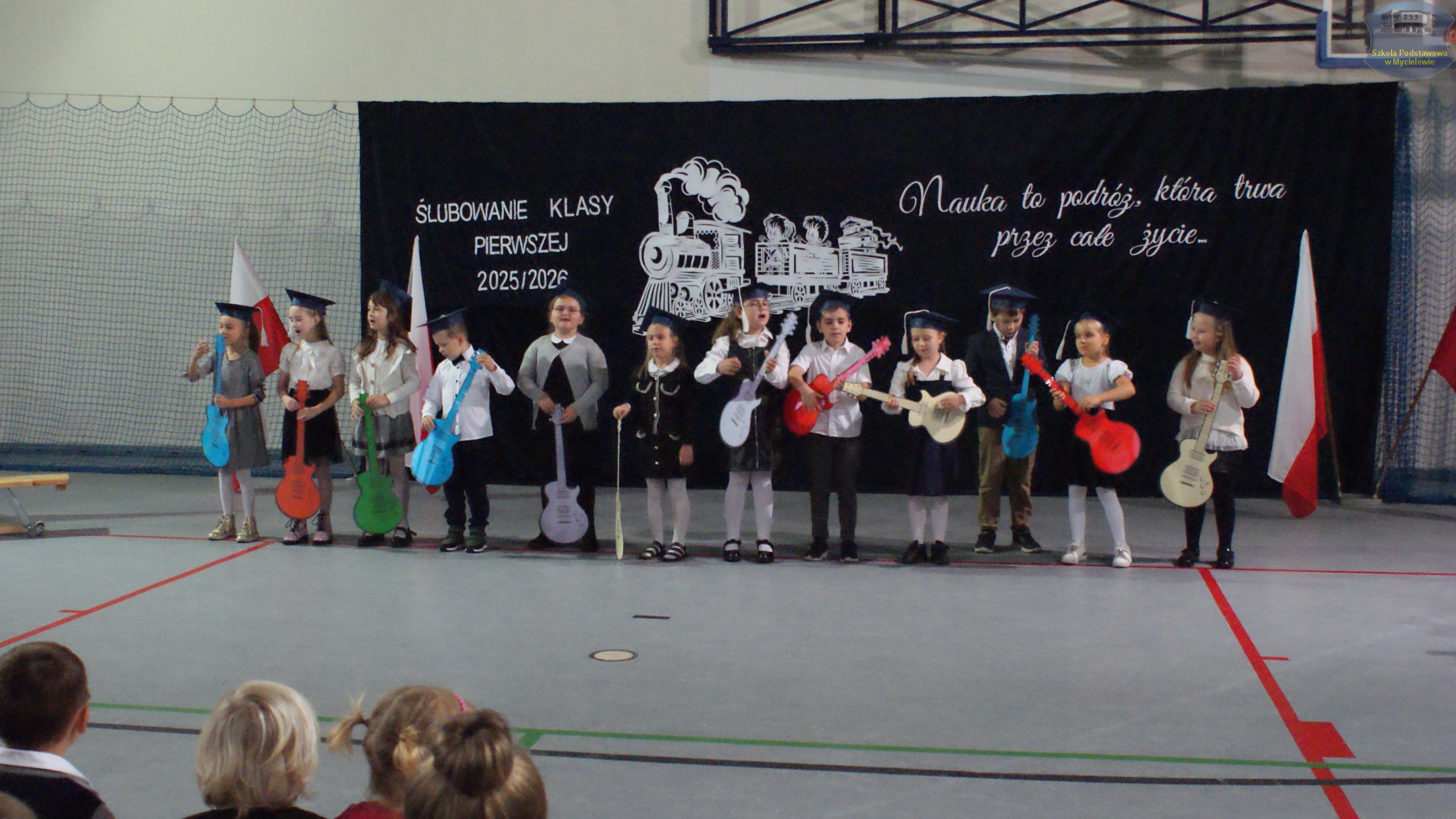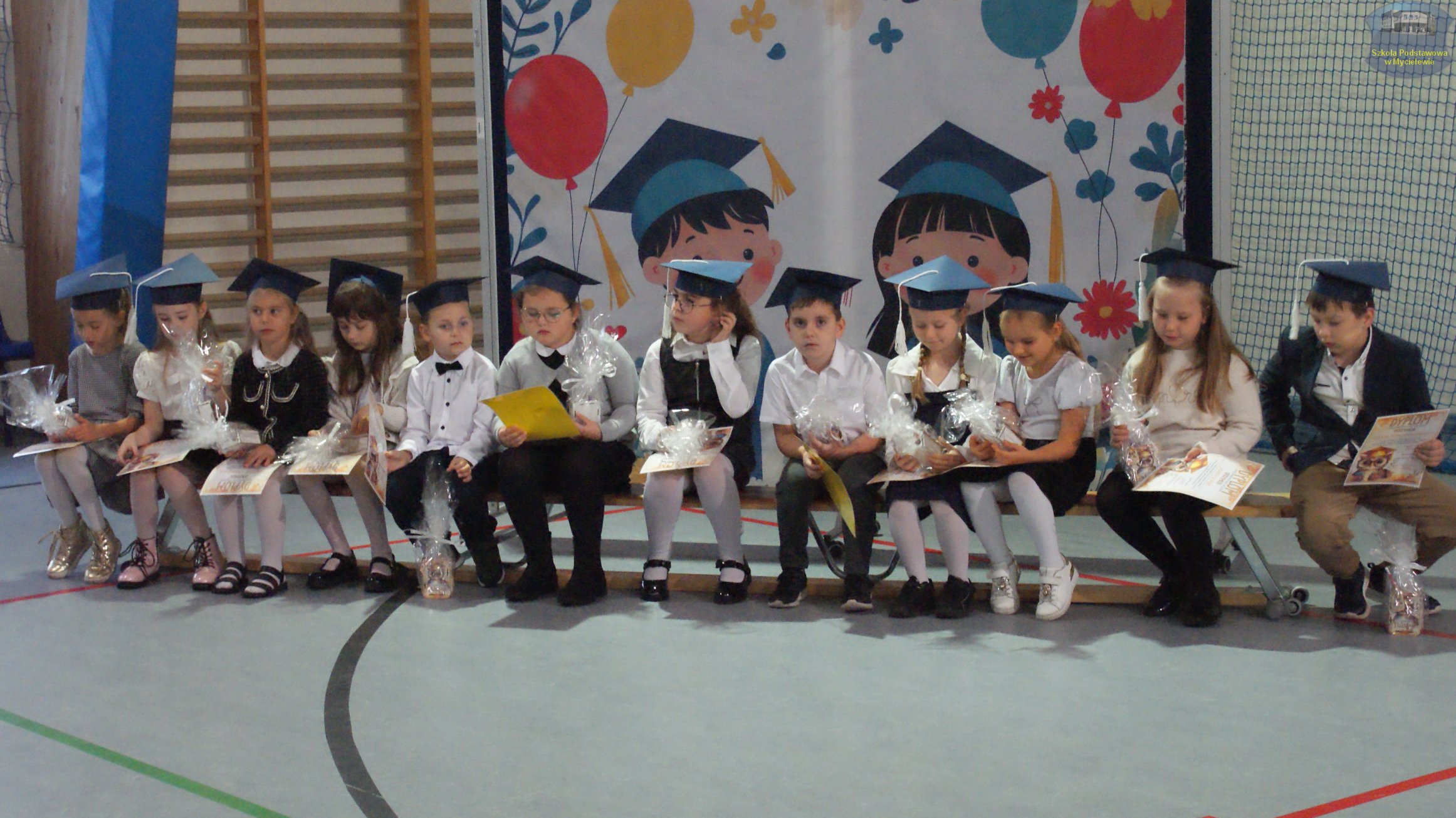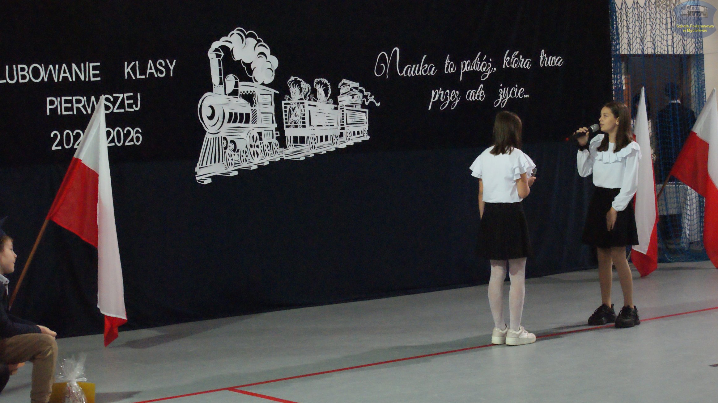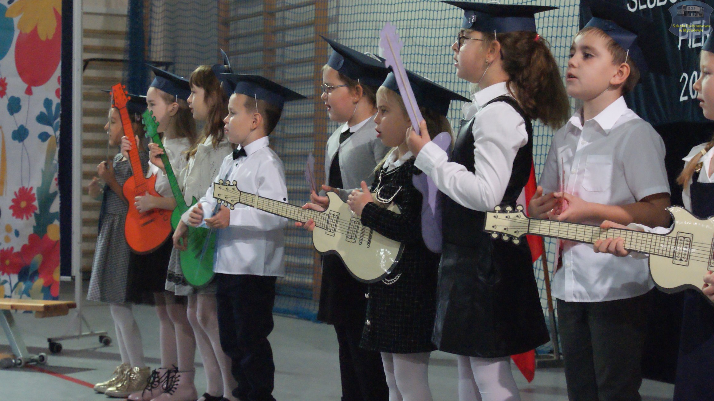 Pierwsza część uroczystości należała do naszych pierwszoklasistów, którzy z wielkim przejęciem, ale i dumą, przystąpili do ceremonii Pasowania na Ucznia. W pięknie udekorowanej sali gimnastycznej rozbrzmiewały piosenki i słowa recytowanych ról z przygotowanego scenariusza pt. „Podróż w Pierwszej Klasie”. Mali artyści z zaangażowaniem udowadniali, że są gotowi, aby dołączyć do szkolnej społeczności.