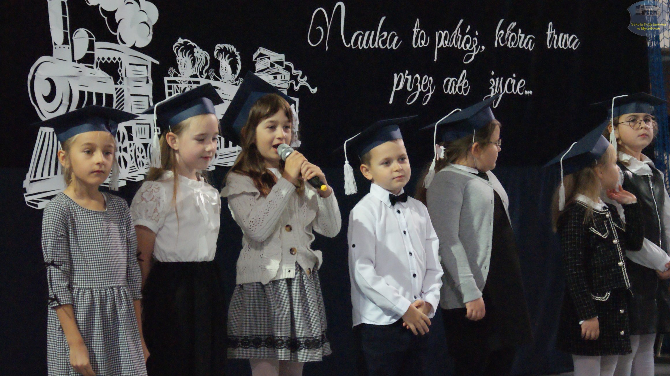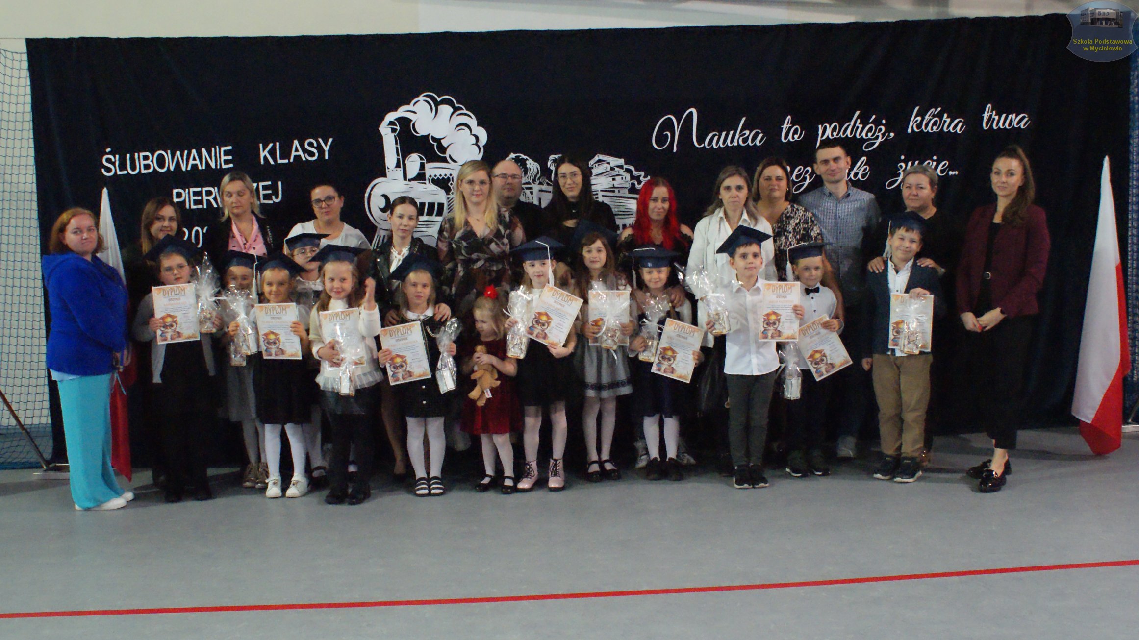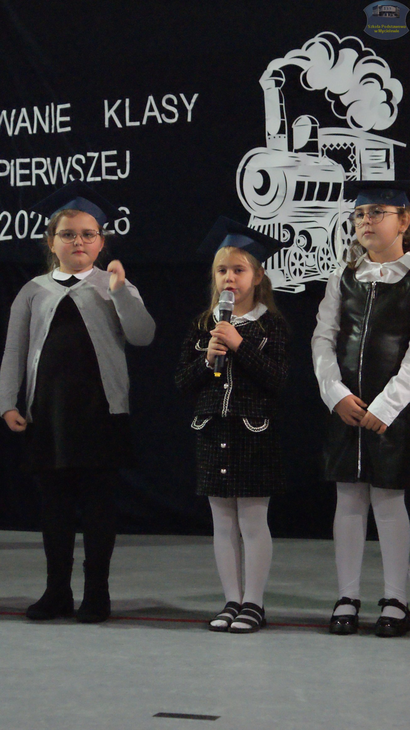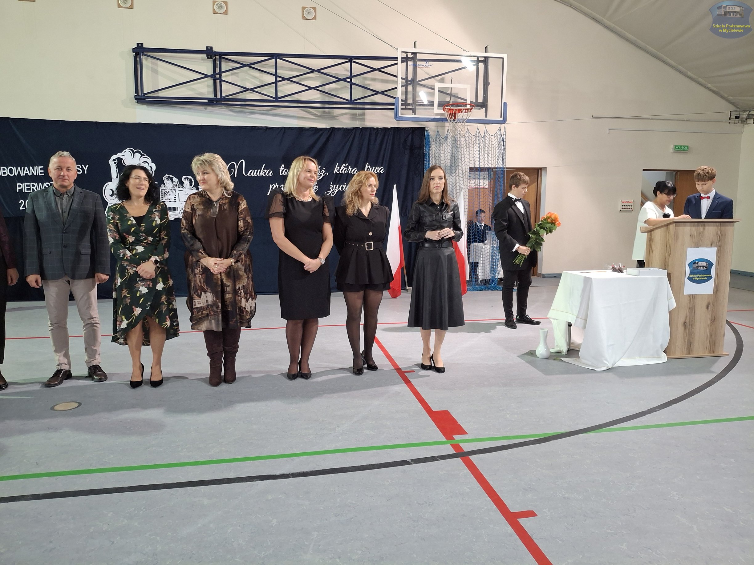Pierwsza część uroczystości należała do naszych pierwszoklasistów, którzy z wielkim przejęciem, ale i dumą, przystąpili do ceremonii Pasowania na Ucznia. W pięknie udekorowanej sali gimnastycznej rozbrzmiewały piosenki i słowa recytowanych ról z przygotowanego scenariusza pt. „Podróż w Pierwszej Klasie”. Mali artyści z zaangażowaniem udowadniali, że są gotowi, aby dołączyć do szkolnej społeczności.