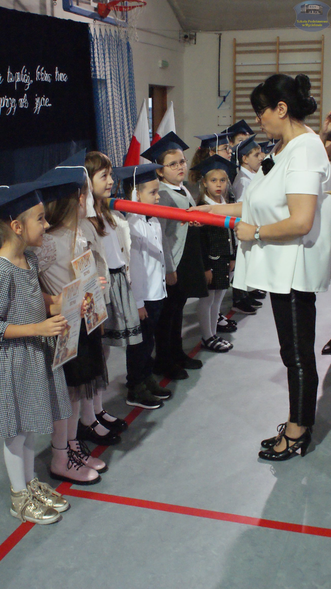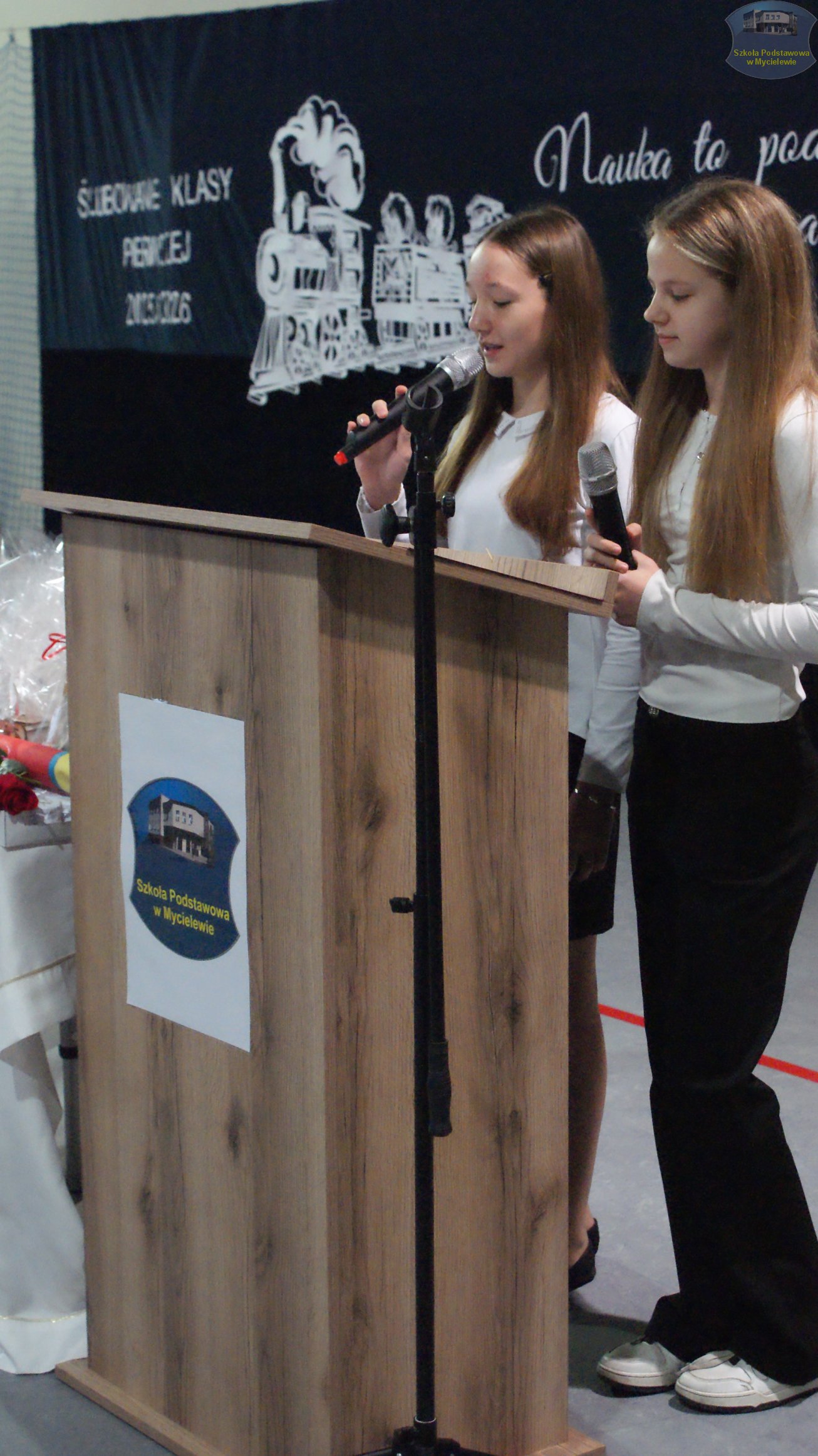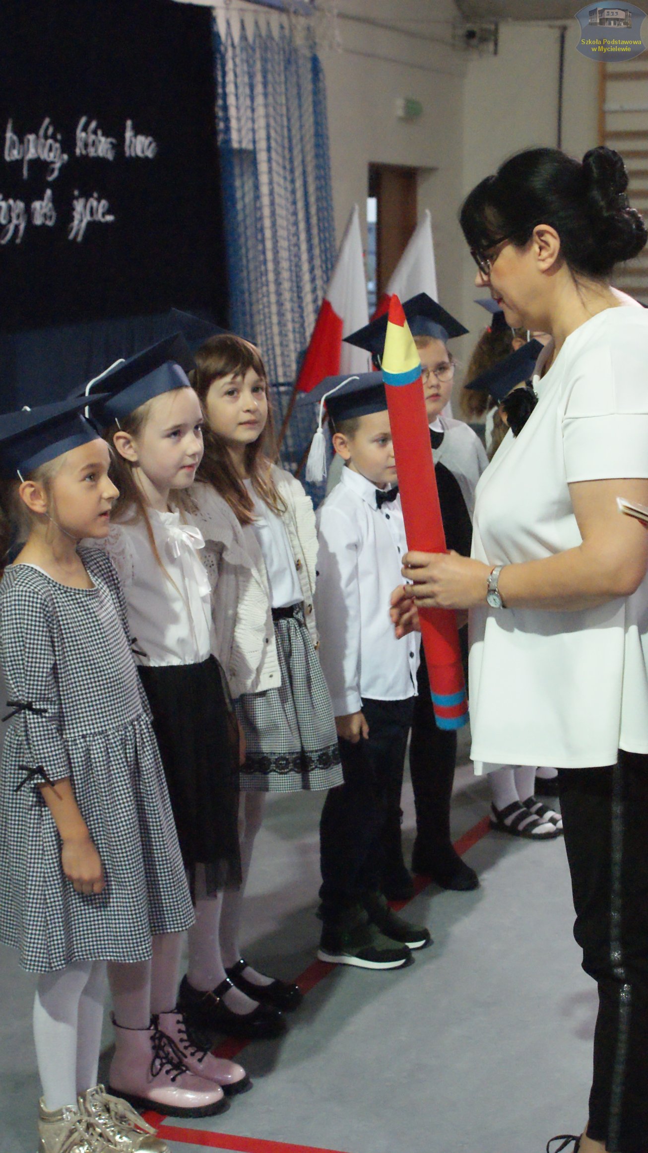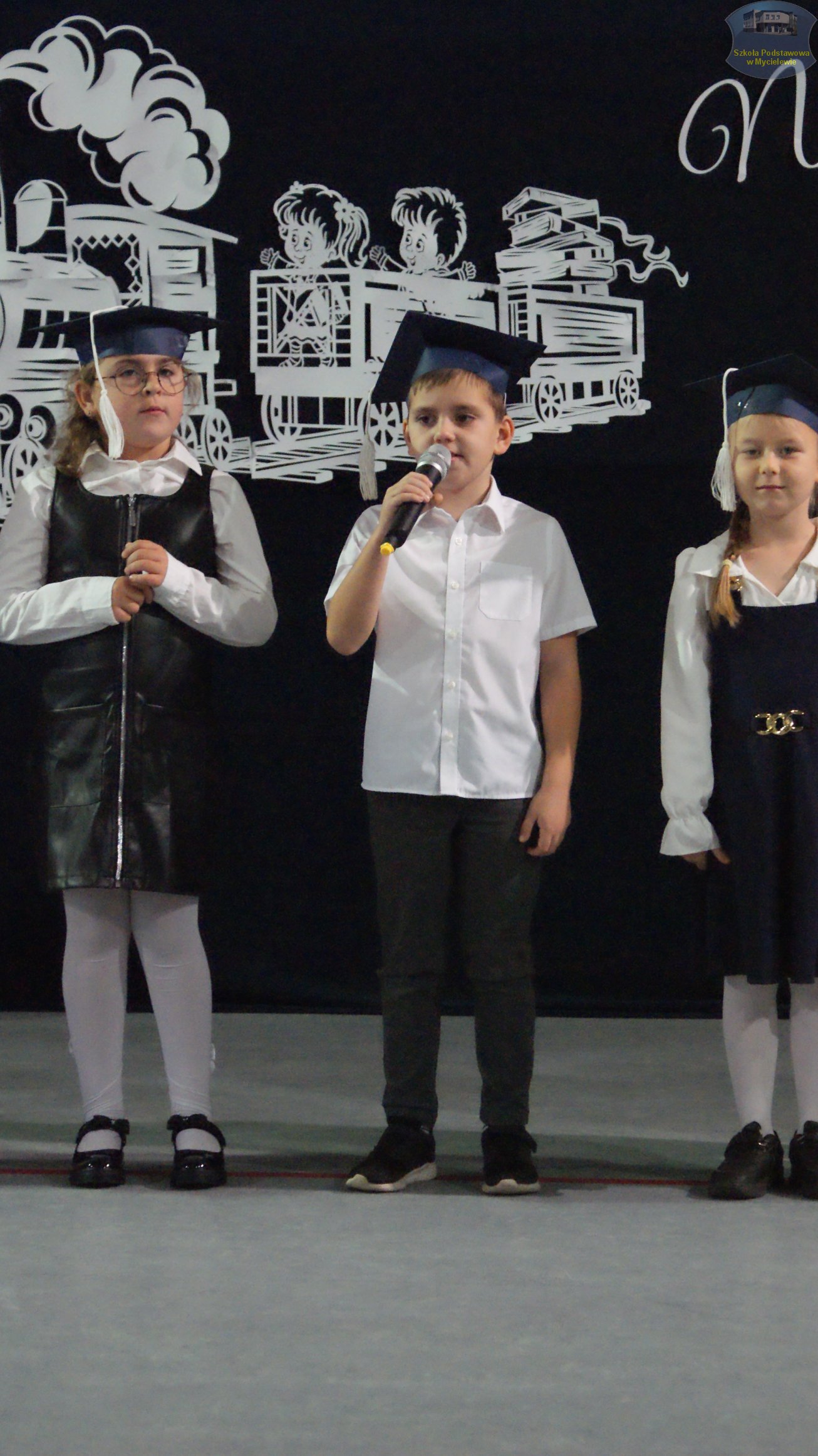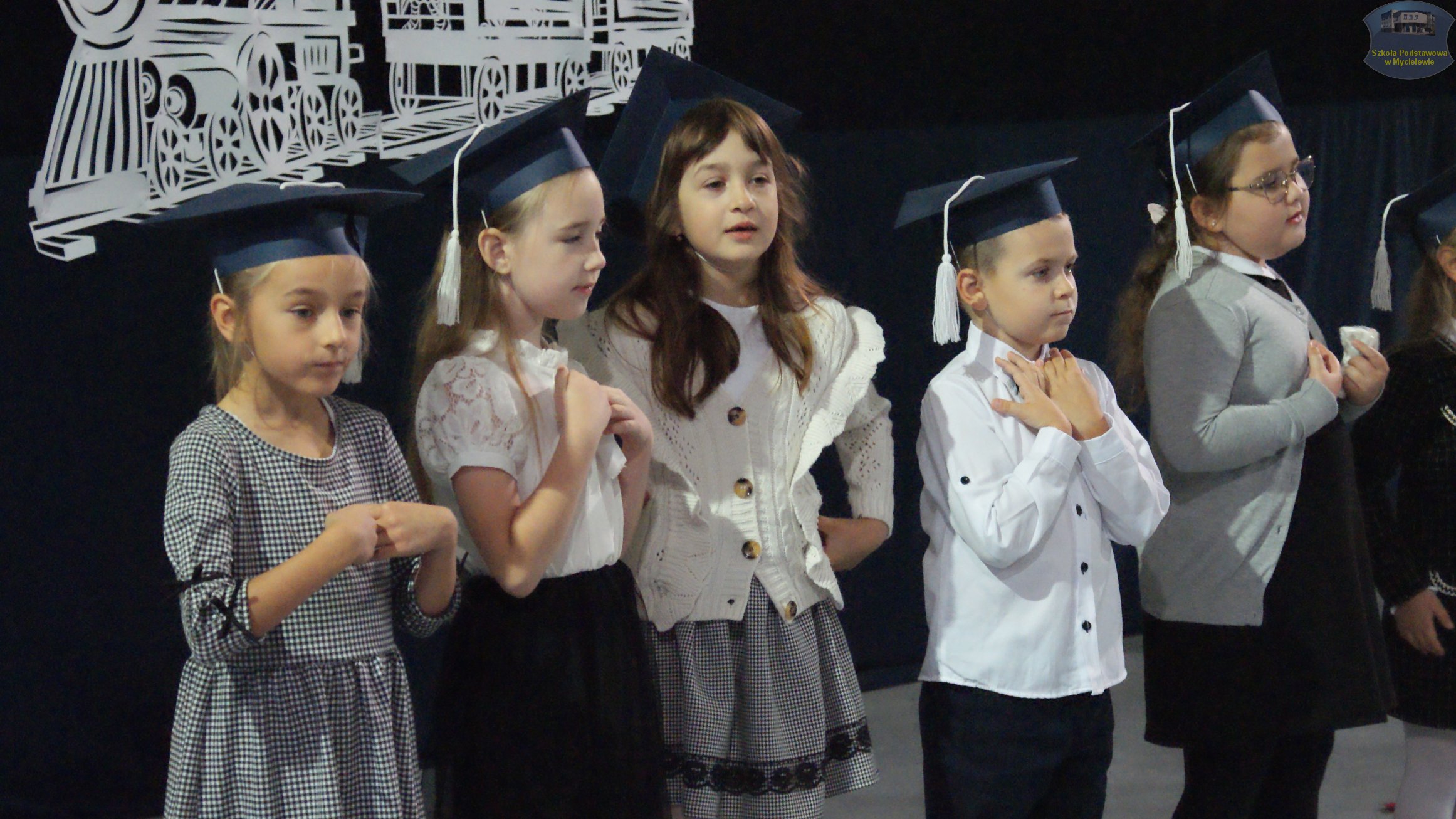 Pierwsza część uroczystości należała do naszych pierwszoklasistów, którzy z wielkim przejęciem, ale i dumą, przystąpili do ceremonii Pasowania na Ucznia. W pięknie udekorowanej sali gimnastycznej rozbrzmiewały piosenki i słowa recytowanych ról z przygotowanego scenariusza pt. „Podróż w Pierwszej Klasie”. Mali artyści z zaangażowaniem udowadniali, że są gotowi, aby dołączyć do szkolnej społeczności.