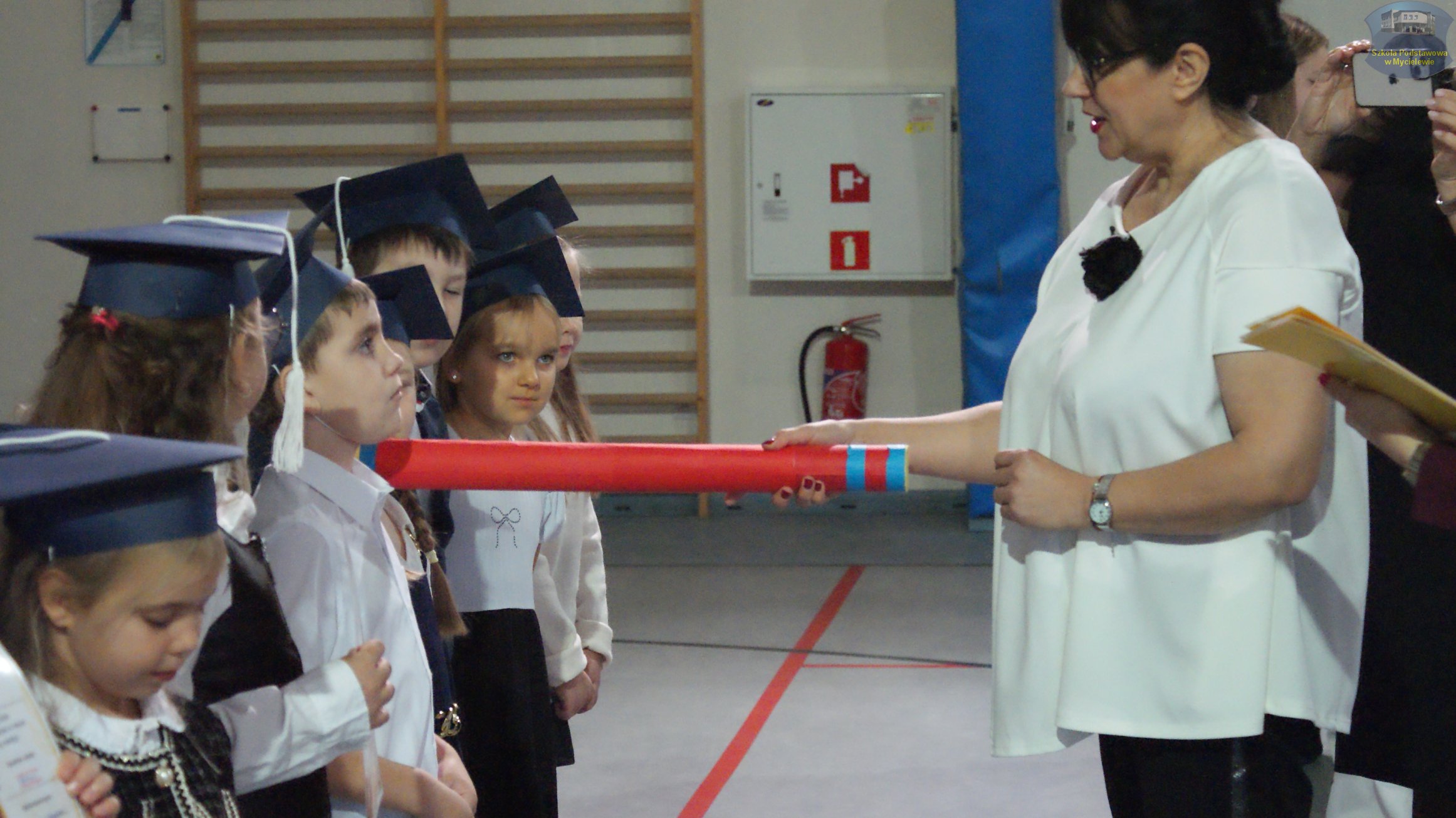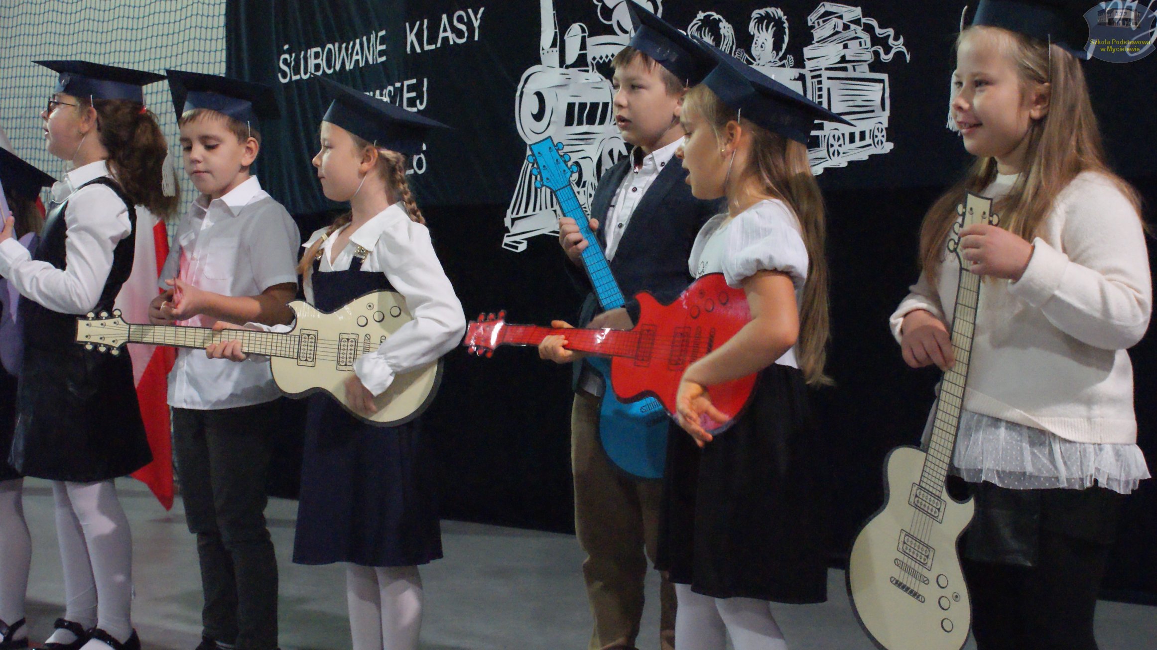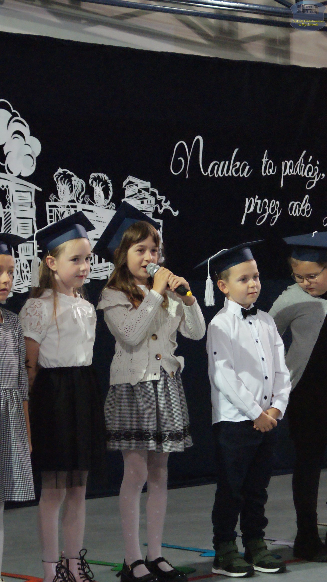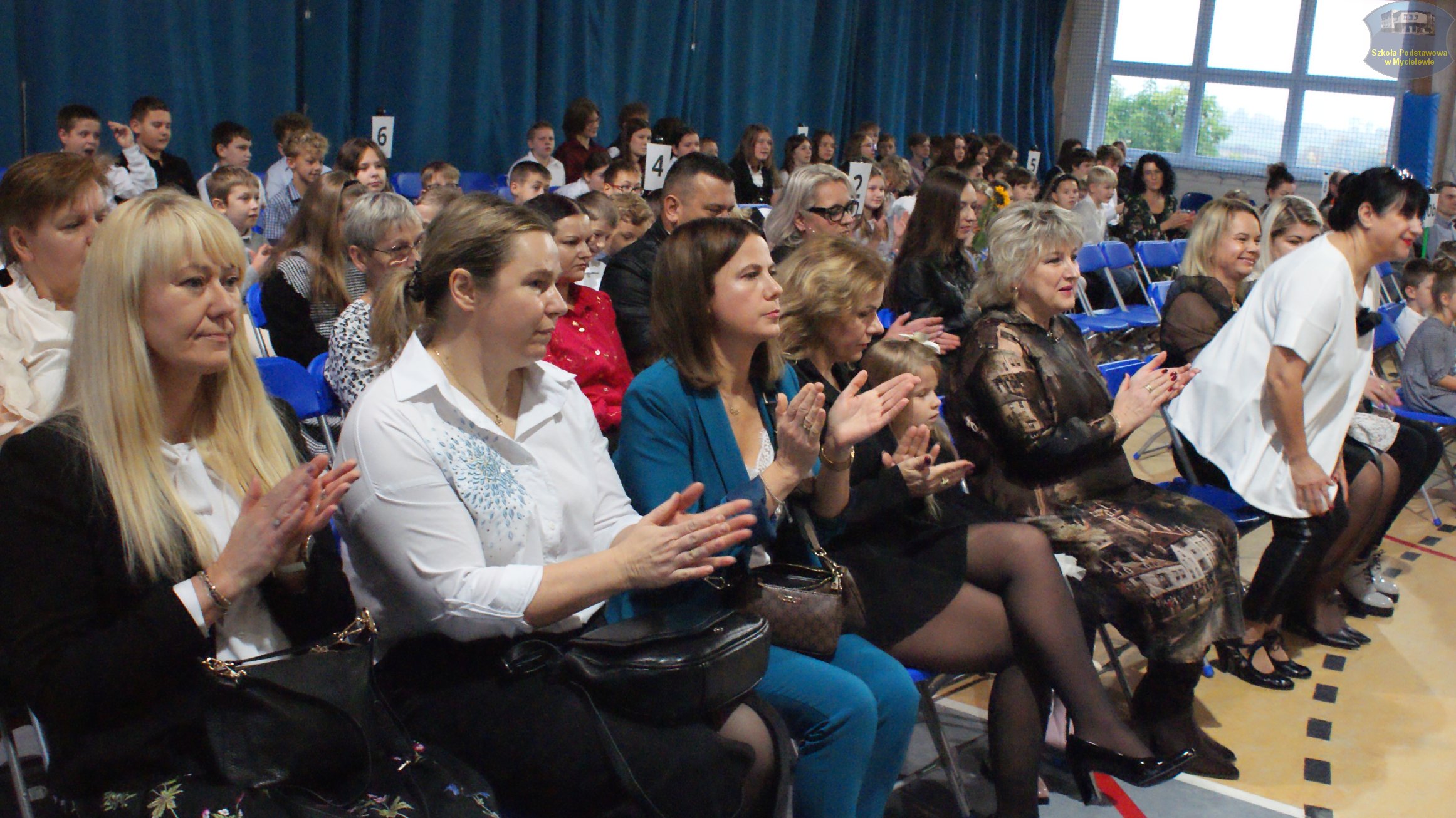Pierwsza część uroczystości należała do naszych pierwszoklasistów, którzy z wielkim przejęciem, ale i dumą, przystąpili do ceremonii Pasowania na Ucznia. W pięknie udekorowanej sali gimnastycznej rozbrzmiewały piosenki i słowa recytowanych ról z przygotowanego scenariusza pt. „Podróż w Pierwszej Klasie”. Mali artyści z zaangażowaniem udowadniali, że są gotowi, aby dołączyć do szkolnej społeczności.