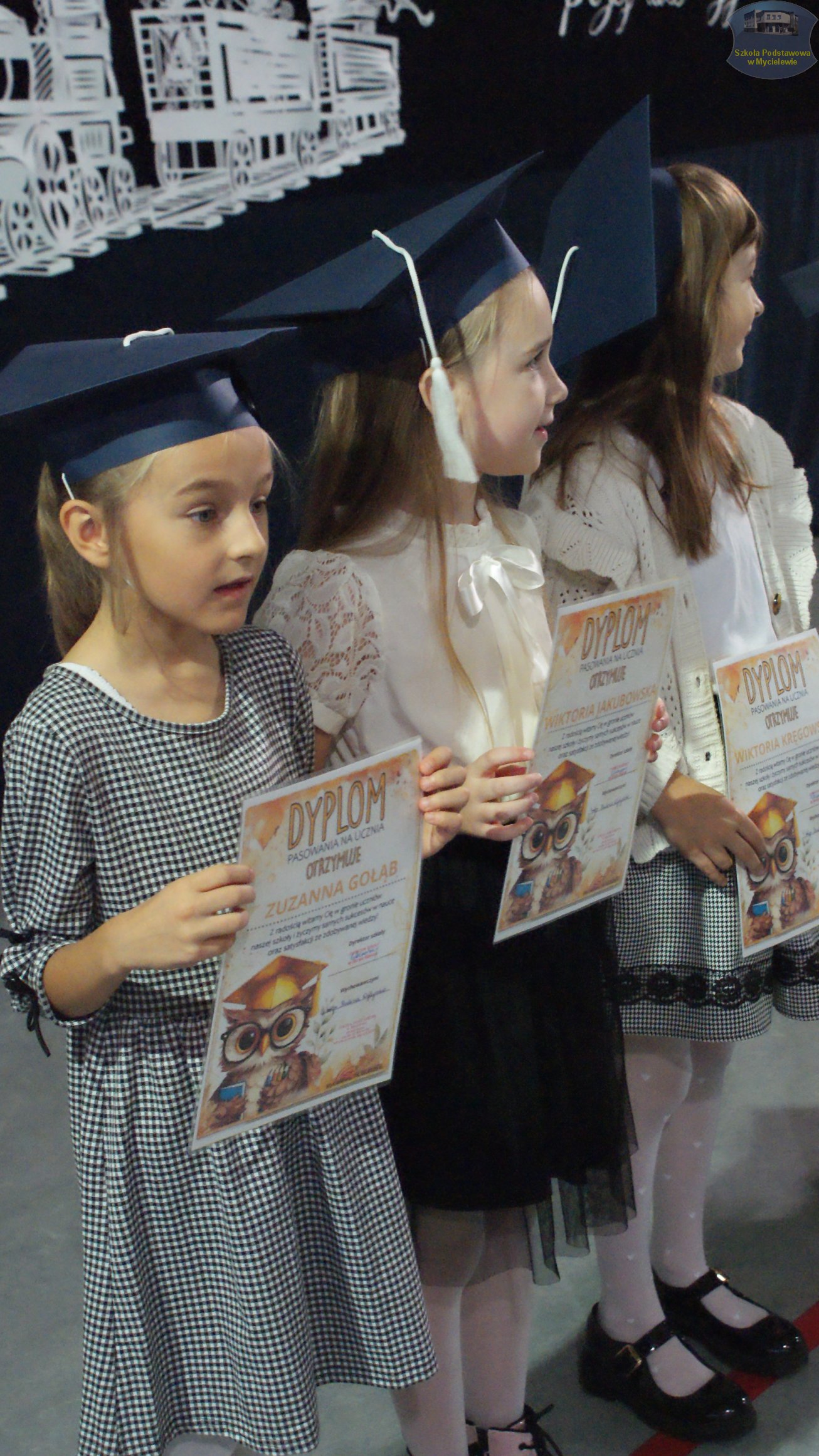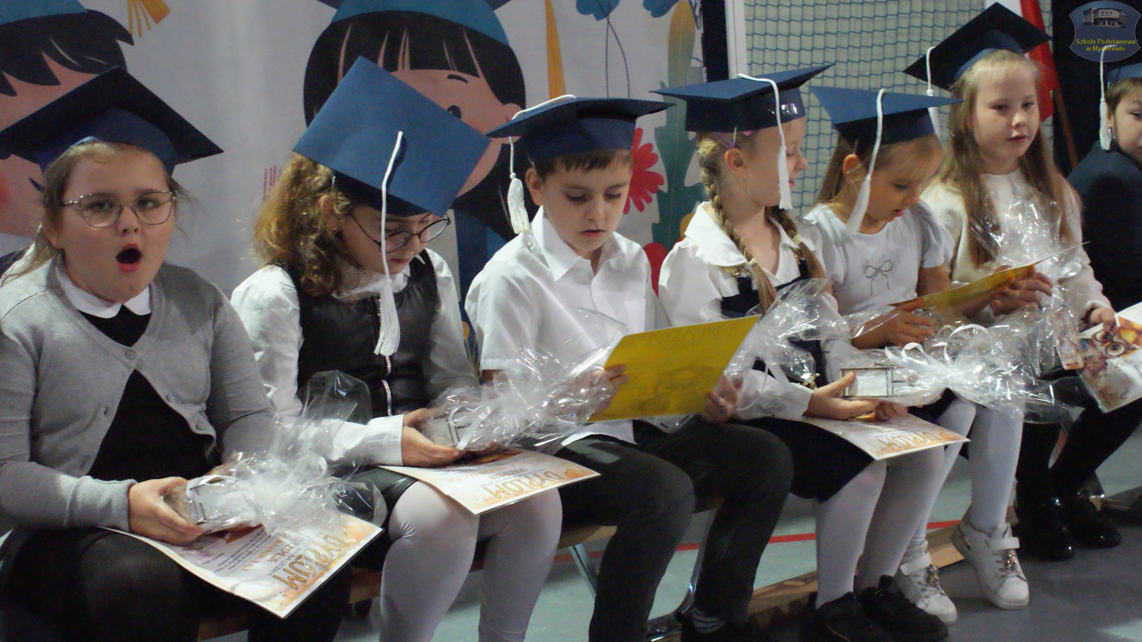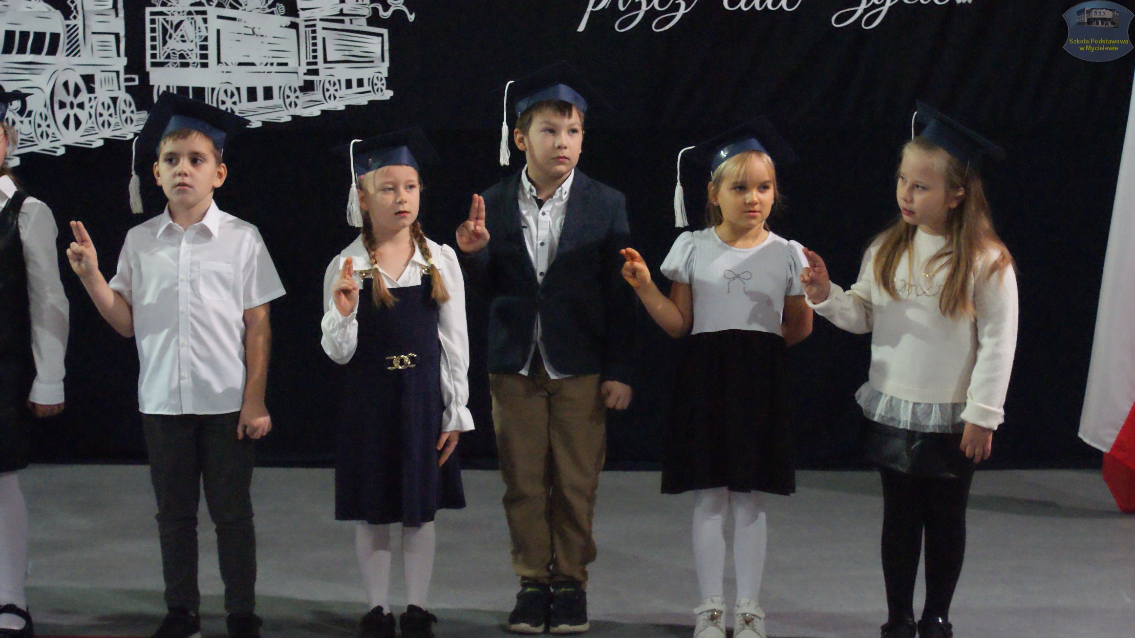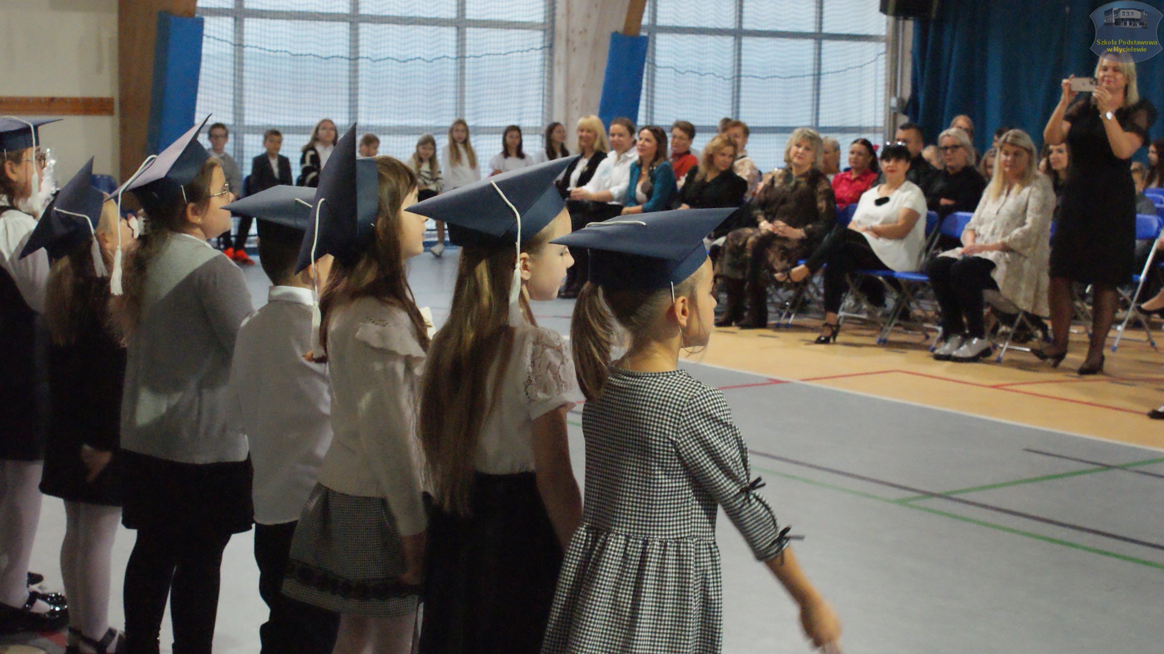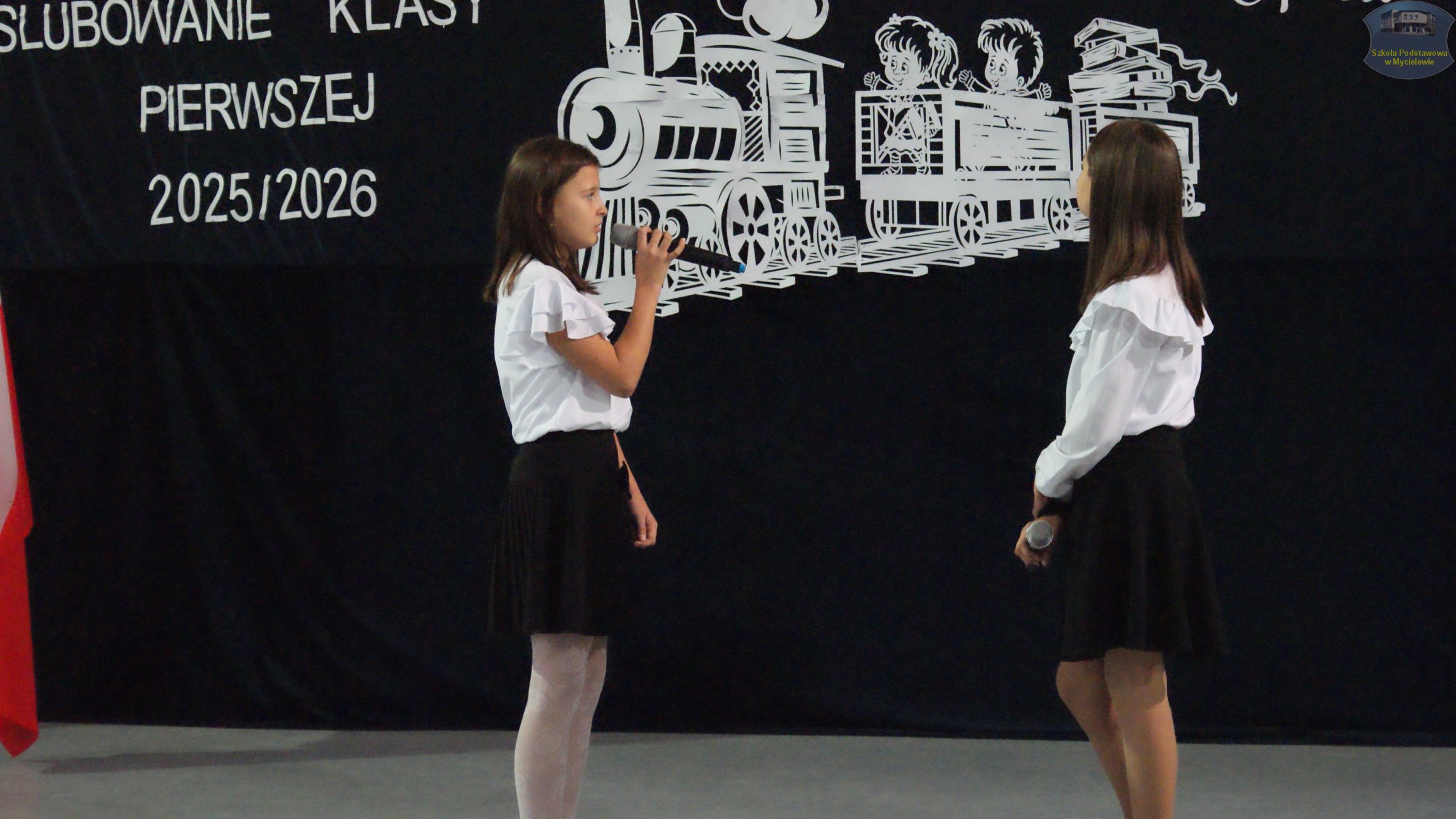 Pierwsza część uroczystości należała do naszych pierwszoklasistów, którzy z wielkim przejęciem, ale i dumą, przystąpili do ceremonii Pasowania na Ucznia. W pięknie udekorowanej sali gimnastycznej rozbrzmiewały piosenki i słowa recytowanych ról z przygotowanego scenariusza pt. „Podróż w Pierwszej Klasie”. Mali artyści z zaangażowaniem udowadniali, że są gotowi, aby dołączyć do szkolnej społeczności.