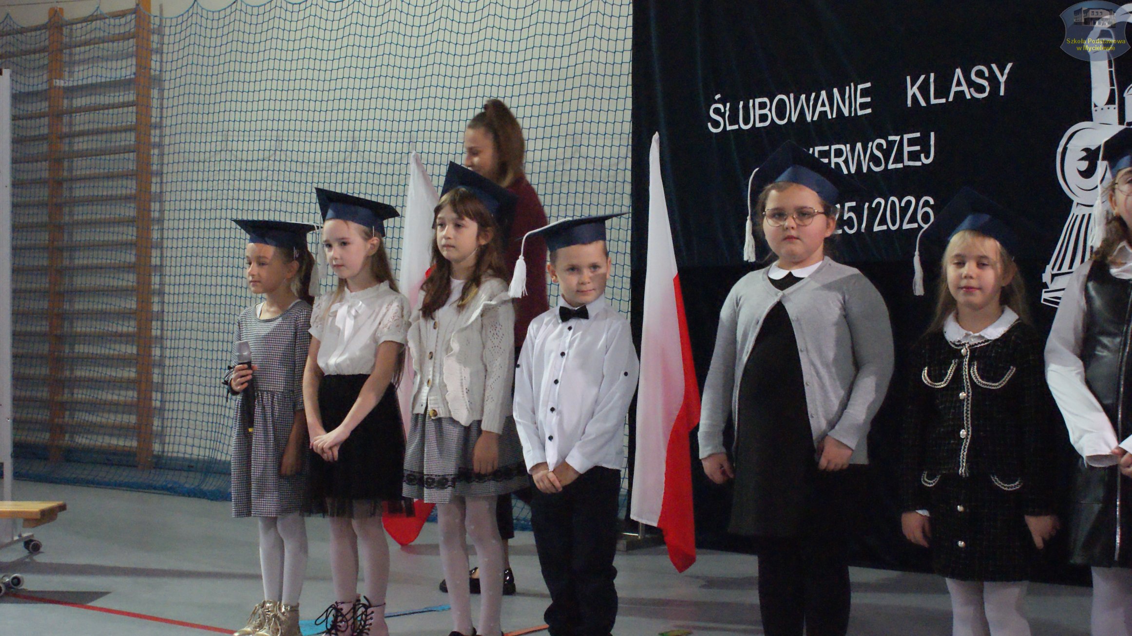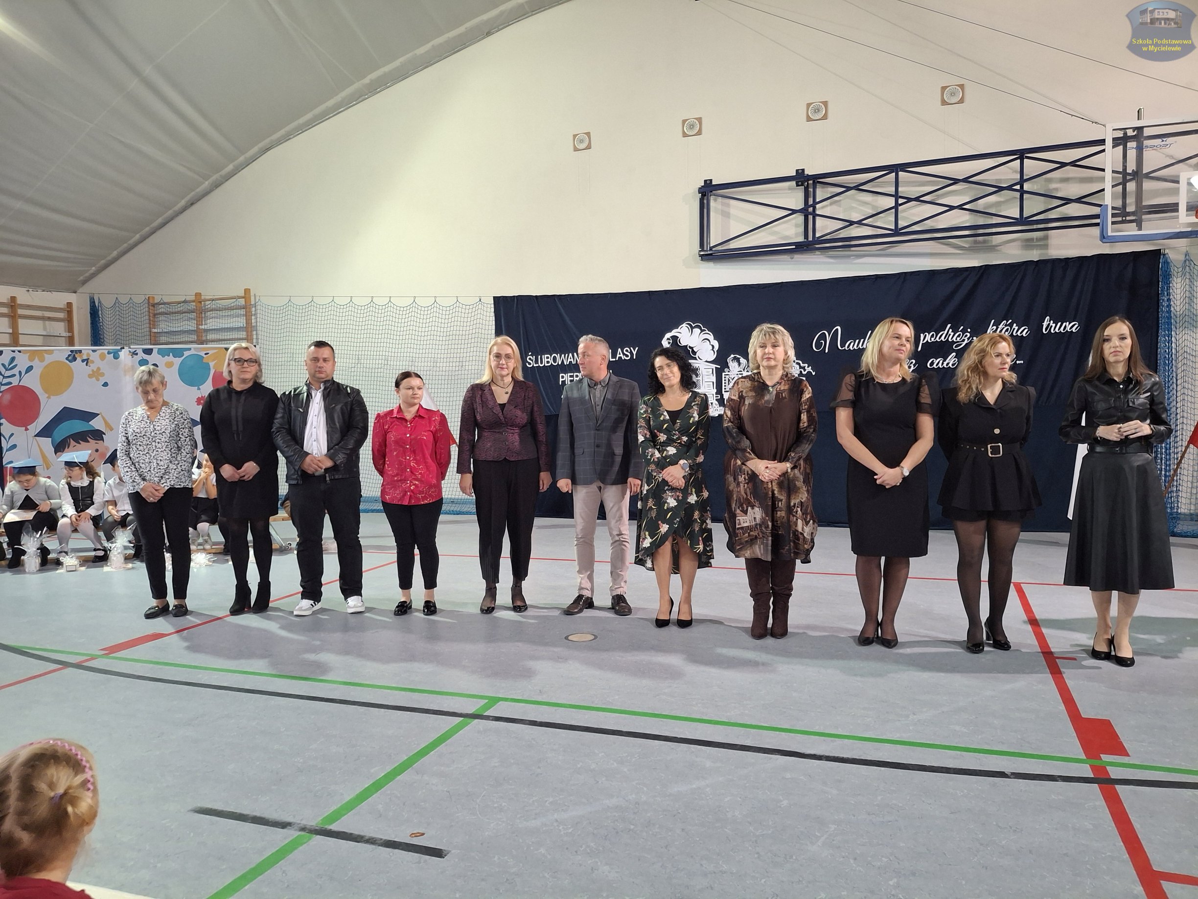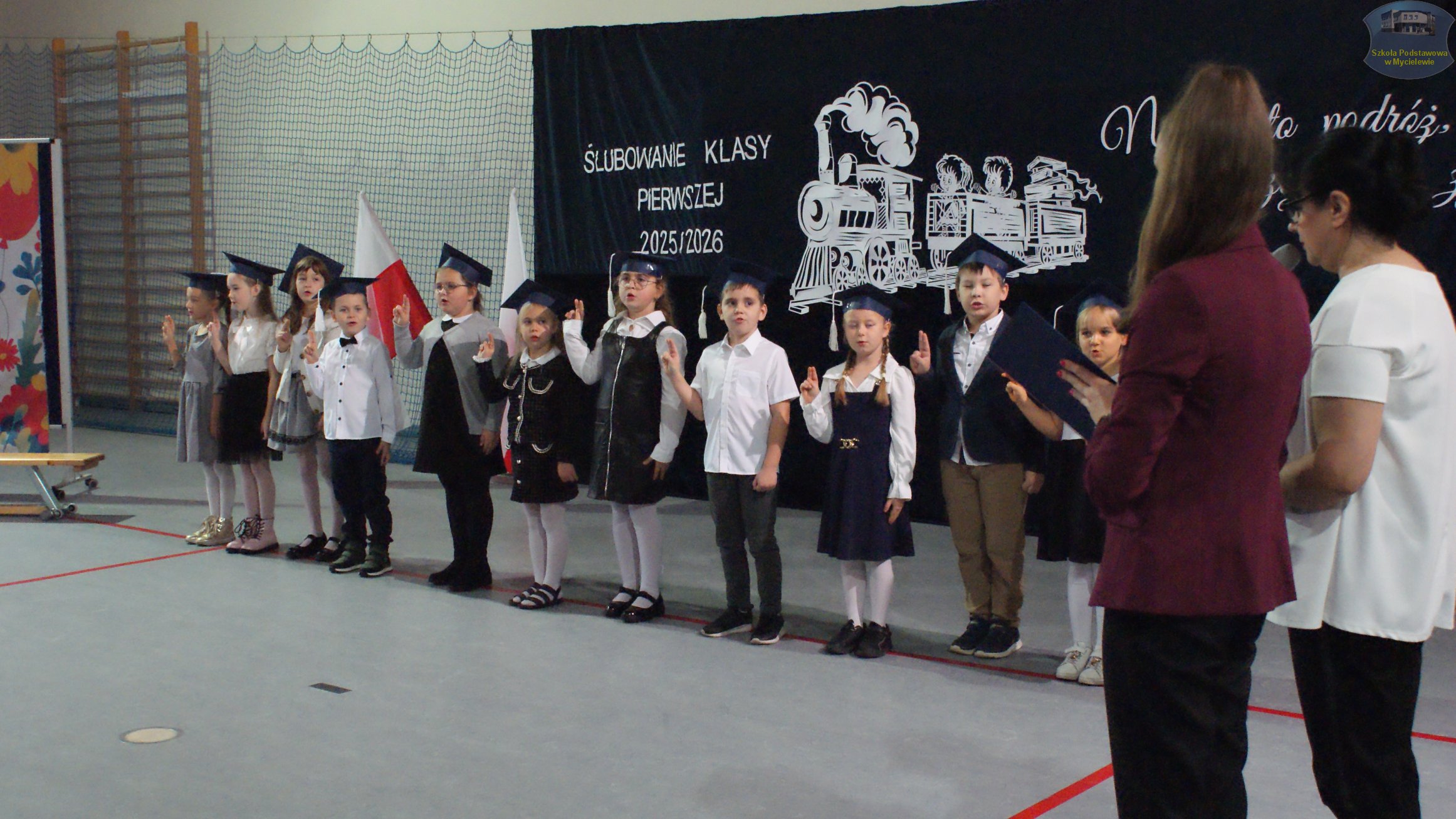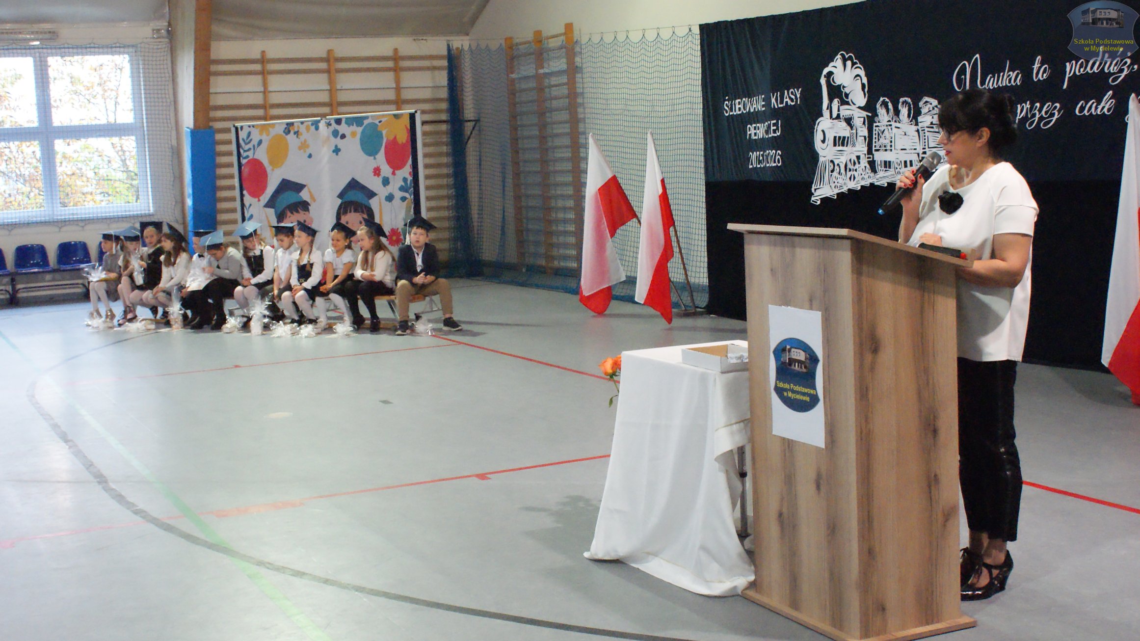 Po występie Pani Dyrektor wygłosiła przemowę skierowaną do najmłodszych, podkreślając, że „nauka to podróż, która trwa przez całe życie”. Następnie pierwszoklasiści złożyli uroczysty akt ślubowania. Pani Dyrektor dotknęła ramienia każdego dziecka ołówkiem – symbolem nauki i mądrości – tym samym przyjmując je do grona uczniów szkoły. Była to wyjątkowa chwila, pełna wzruszeń dla rodziców i radości dla dzieci. Na pamiątkę tego dnia pierwszoklasiści otrzymali dyplomy i upominki. Po uroczystości czekała na nich słodka niespodzianka – tort przygotowany specjalnie z okazji ich święta.