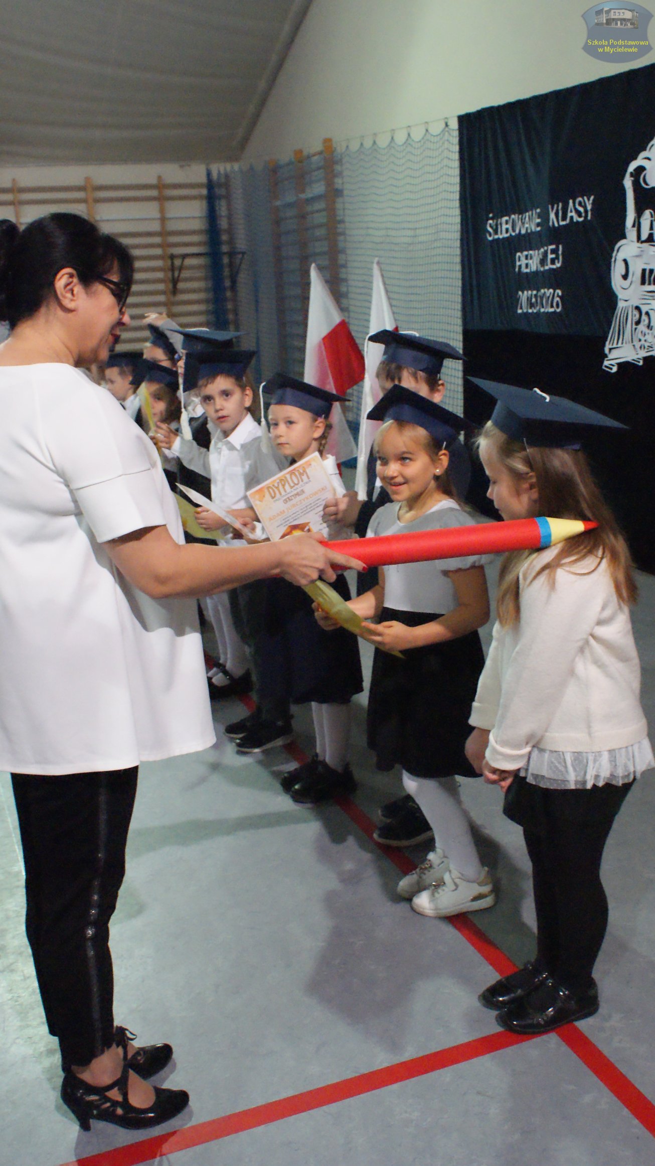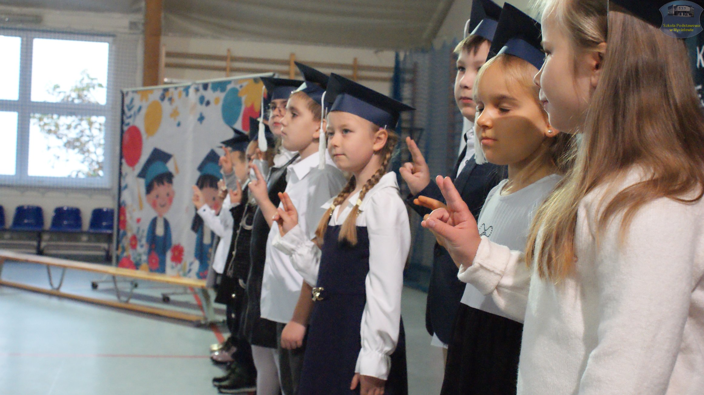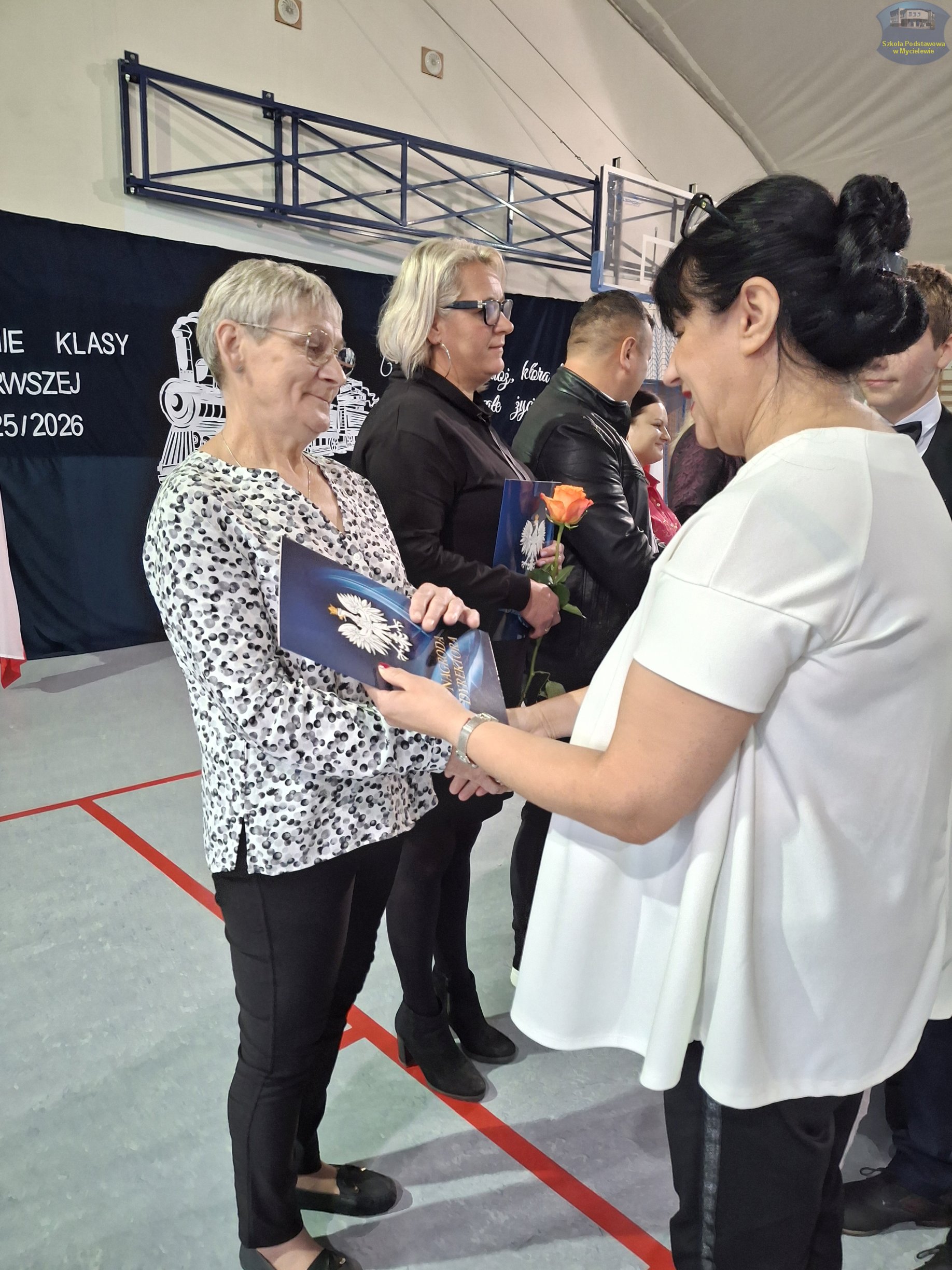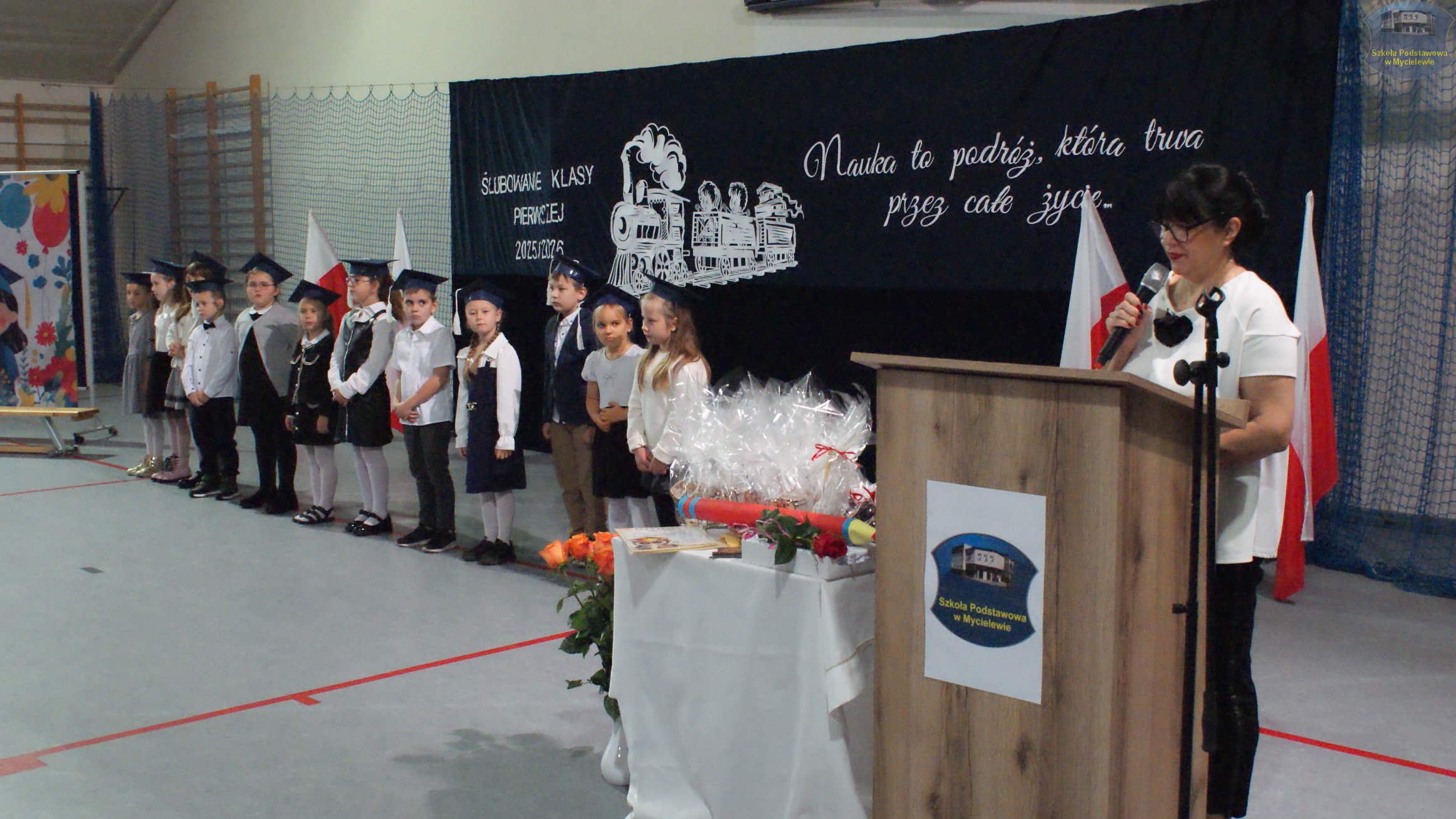 Po występie Pani Dyrektor wygłosiła przemowę skierowaną do najmłodszych, podkreślając, że „nauka to podróż, która trwa przez całe życie”. Następnie pierwszoklasiści złożyli uroczysty akt ślubowania. Pani Dyrektor dotknęła ramienia każdego dziecka ołówkiem – symbolem nauki i mądrości – tym samym przyjmując je do grona uczniów szkoły. Była to wyjątkowa chwila, pełna wzruszeń dla rodziców i radości dla dzieci. Na pamiątkę tego dnia pierwszoklasiści otrzymali dyplomy i upominki. Po uroczystości czekała na nich słodka niespodzianka – tort przygotowany specjalnie z okazji ich święta.