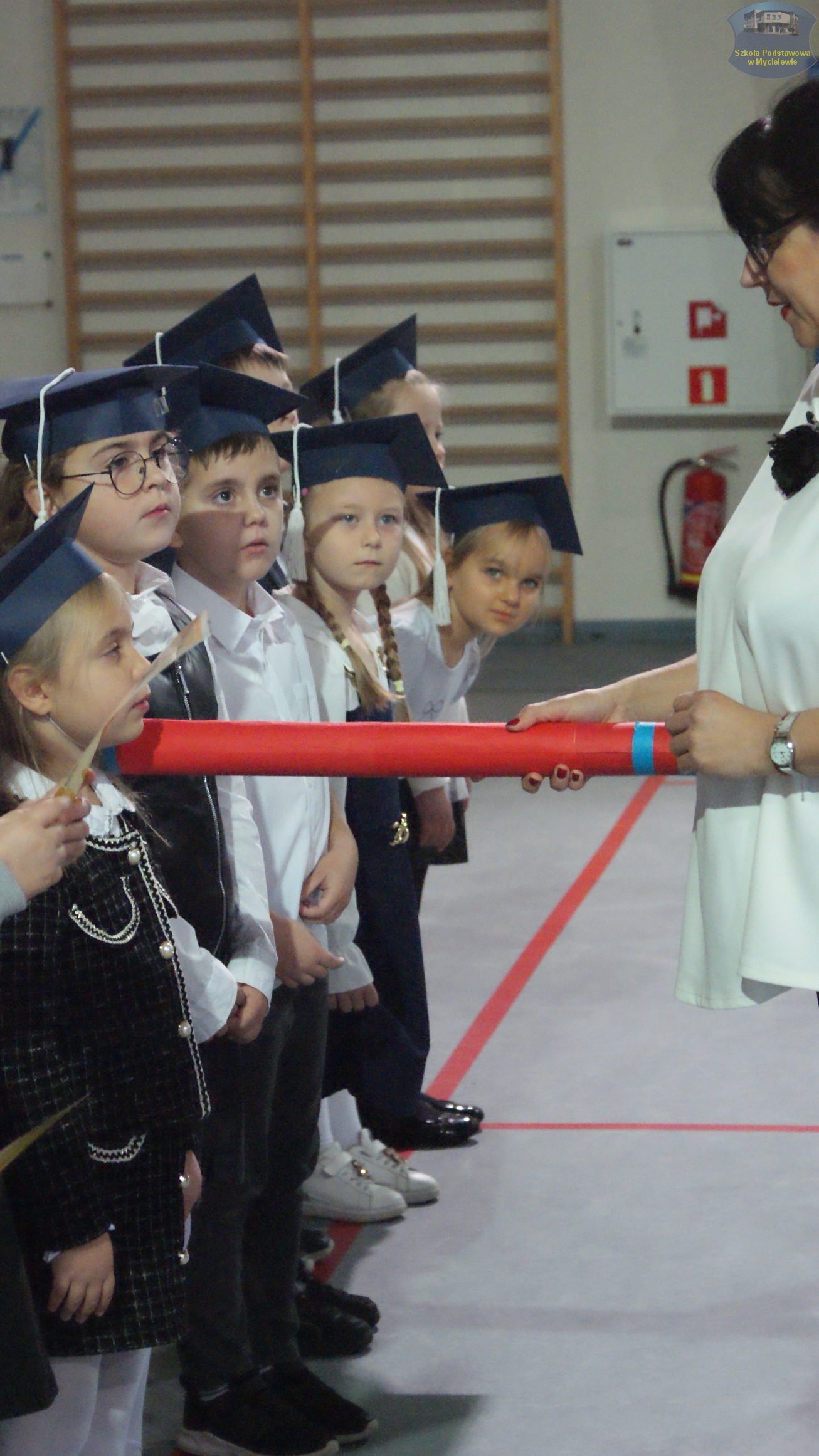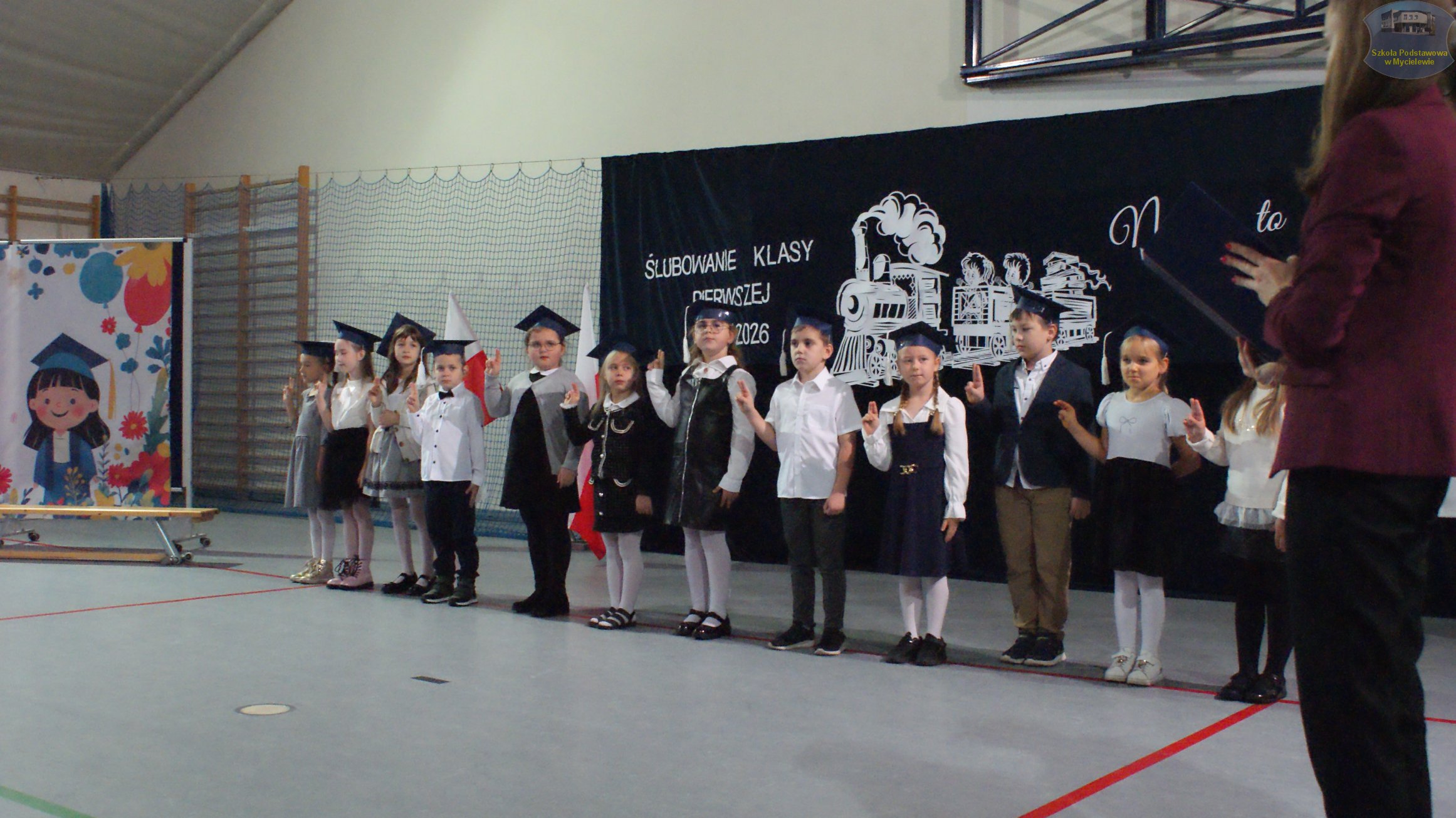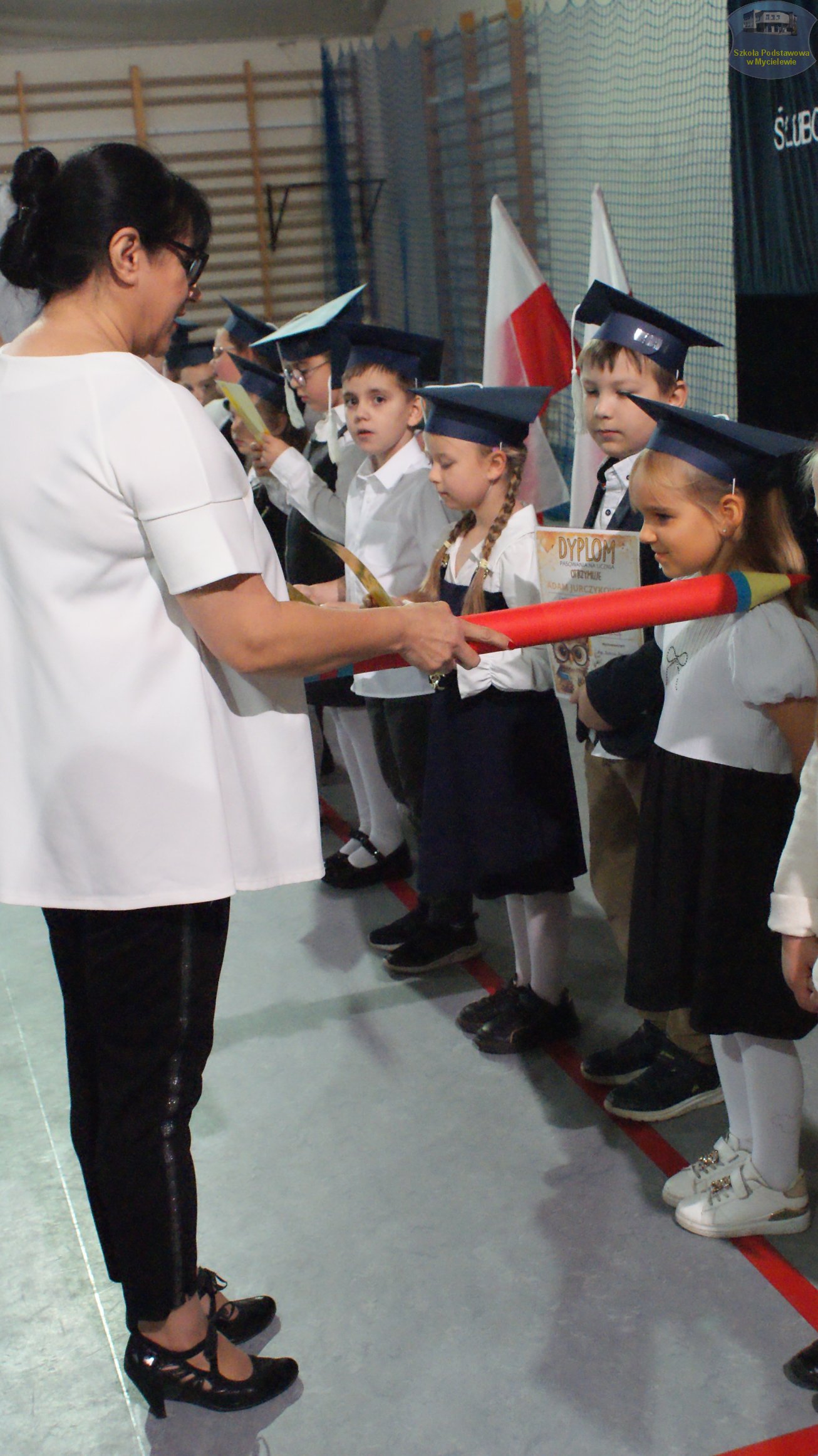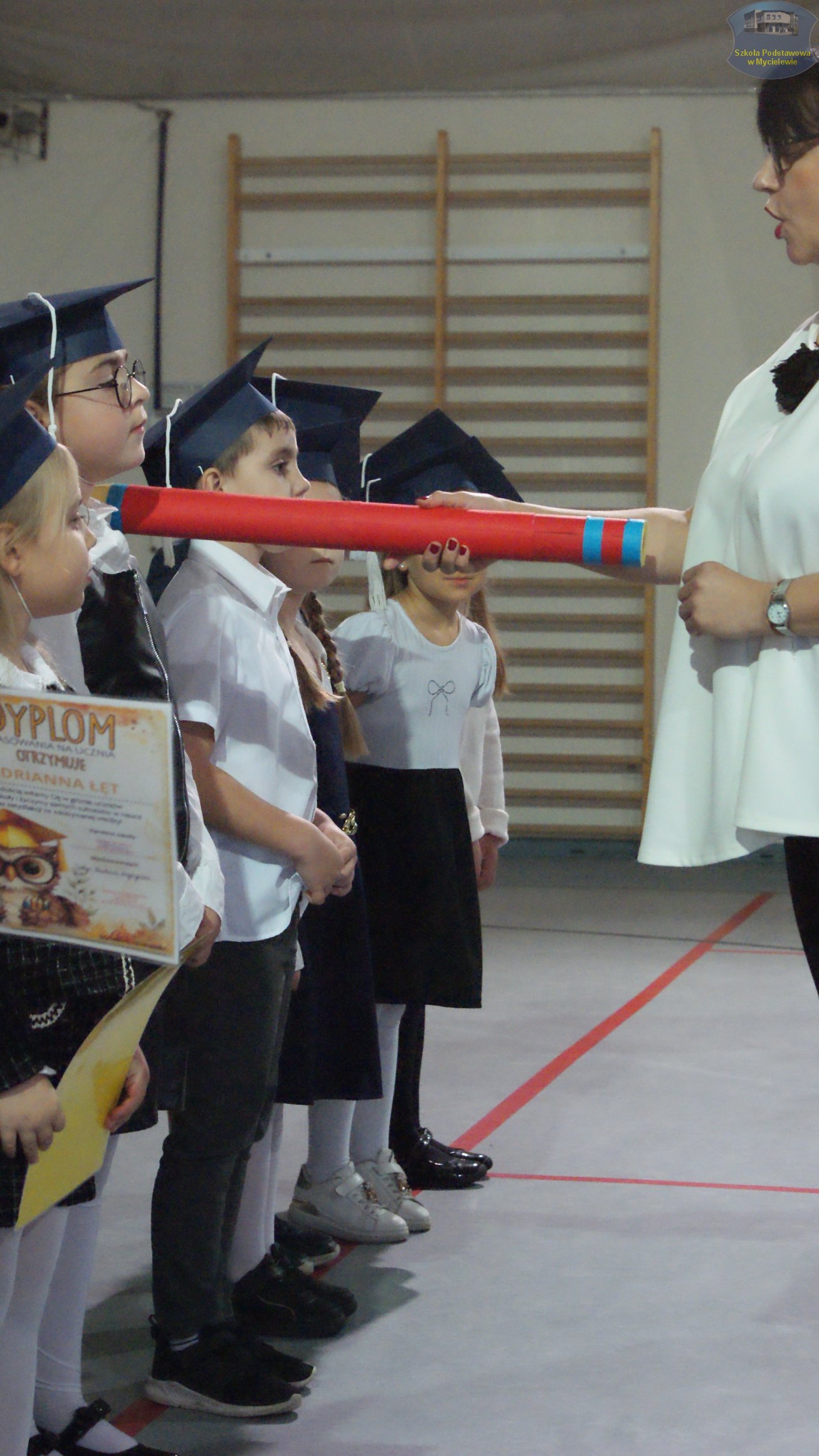 Po występie Pani Dyrektor wygłosiła przemowę skierowaną do najmłodszych, podkreślając, że „nauka to podróż, która trwa przez całe życie”. Następnie pierwszoklasiści złożyli uroczysty akt ślubowania. Pani Dyrektor dotknęła ramienia każdego dziecka ołówkiem – symbolem nauki i mądrości – tym samym przyjmując je do grona uczniów szkoły. Była to wyjątkowa chwila, pełna wzruszeń dla rodziców i radości dla dzieci. Na pamiątkę tego dnia pierwszoklasiści otrzymali dyplomy i upominki. Po uroczystości czekała na nich słodka niespodzianka – tort przygotowany specjalnie z okazji ich święta.