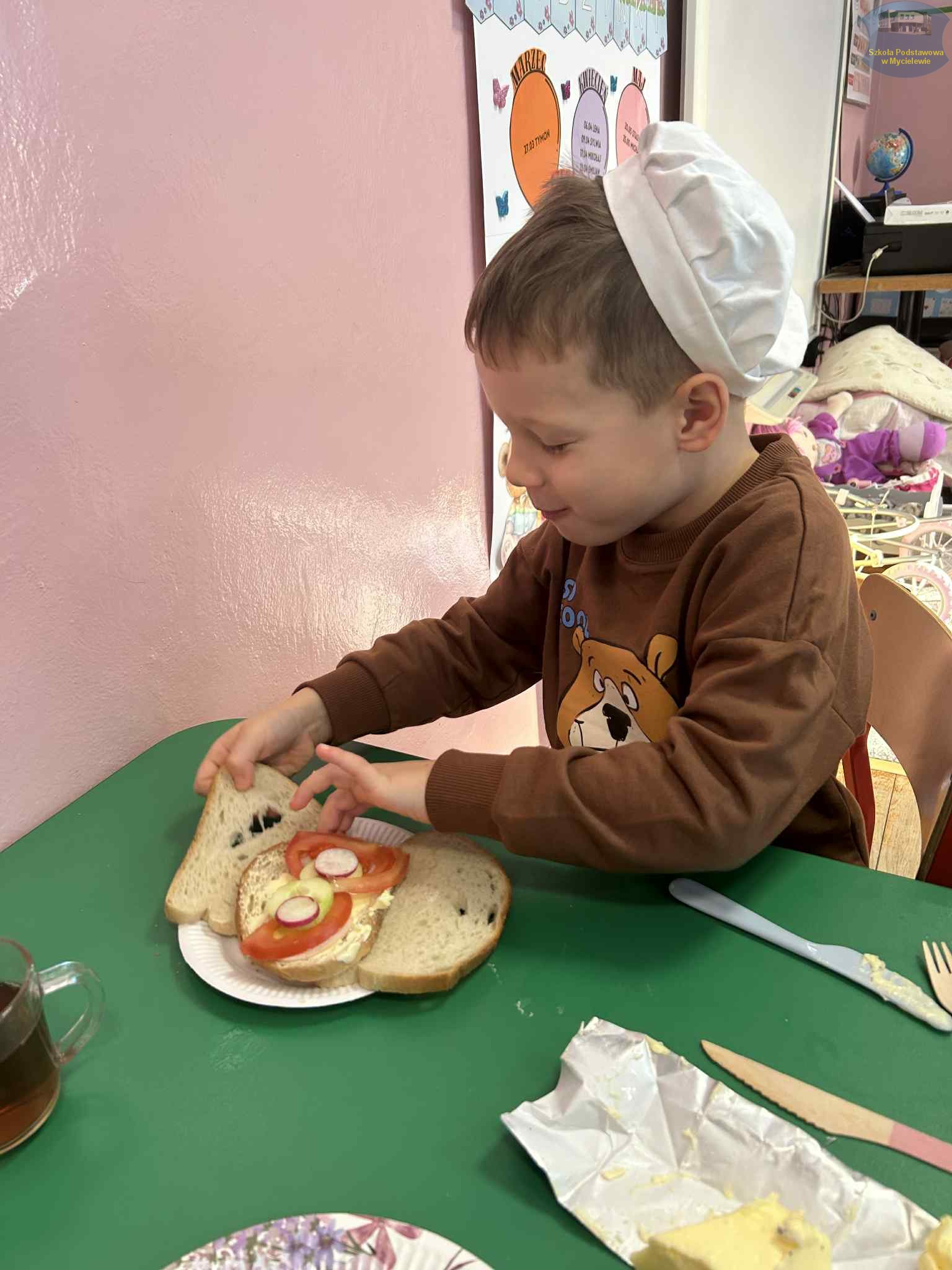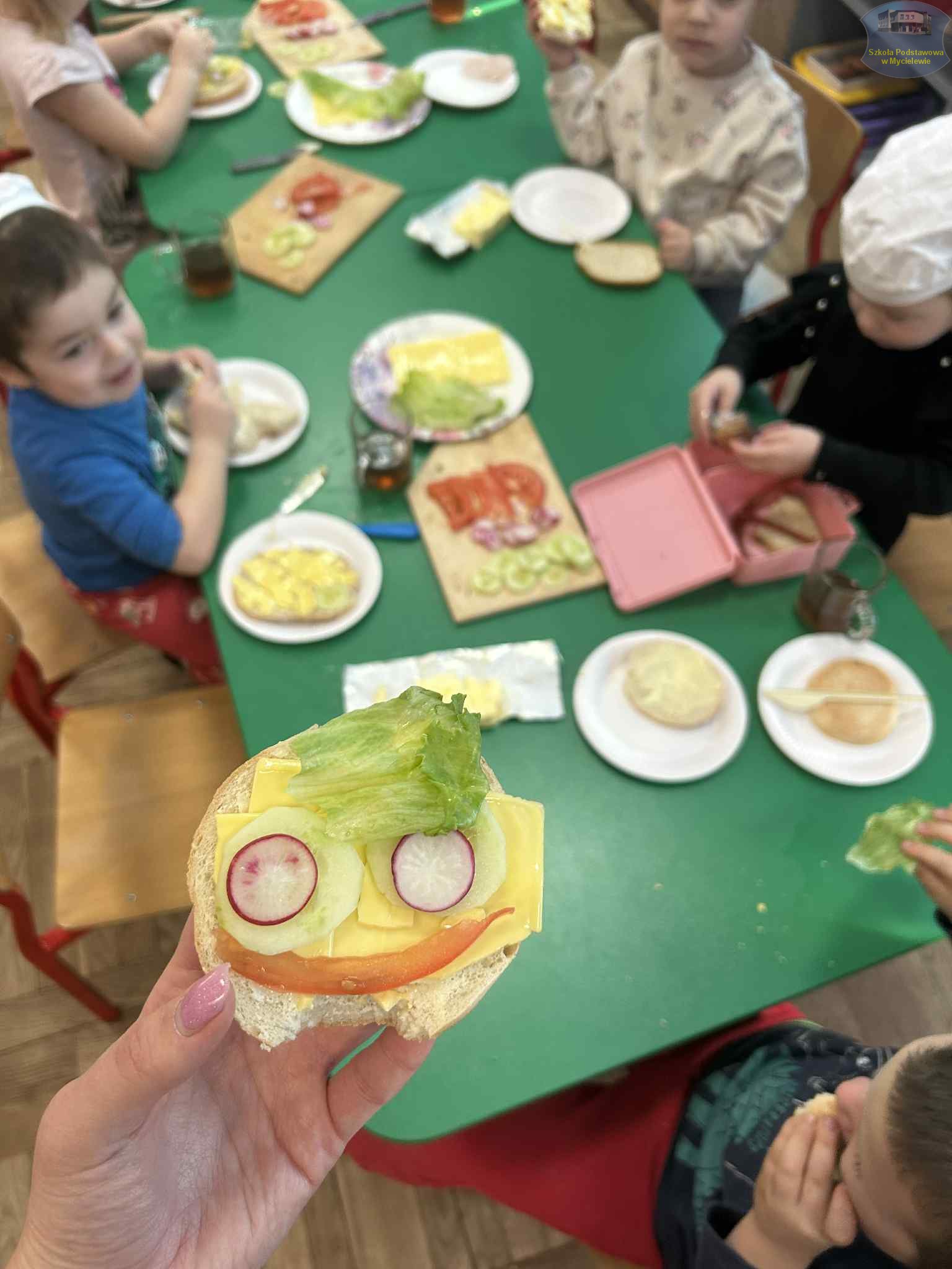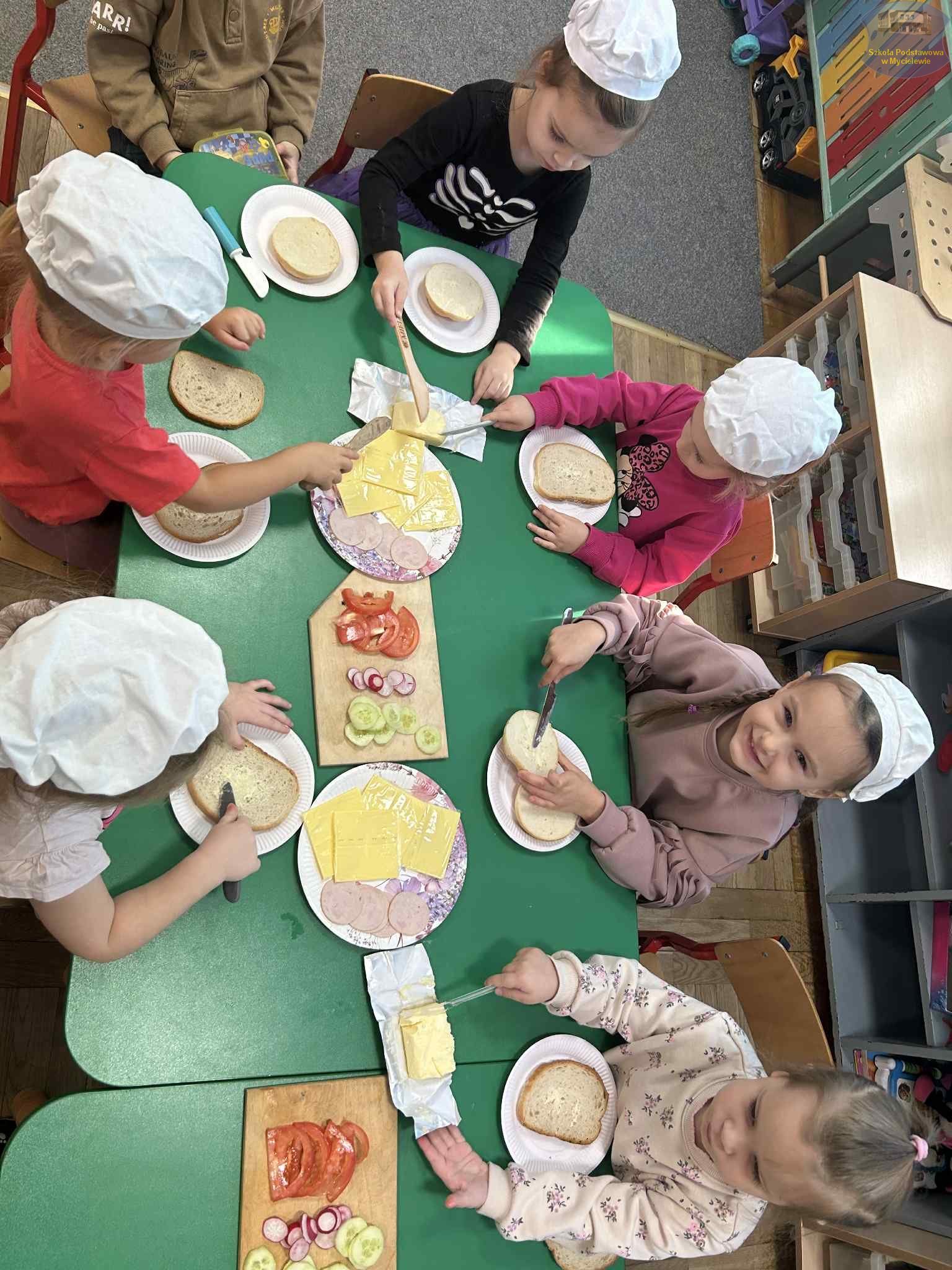 Dzień rozpoczął się od wspólnego przygotowywania zdrowych kanapek. Na stołach pojawiły się świeże warzywa: pomidory, ogórki, rzodkiewki, sałata, a także ser, chude wędliny i pełnoziarniste pieczywo. Przedszkolaki z zaangażowaniem komponowały swoje kanapki, tworząc prawdziwe, małe dzieła sztuki. Dzięki temu uczyły się, jak ważne jest korzystanie z różnorodnych i świeżych produktów.