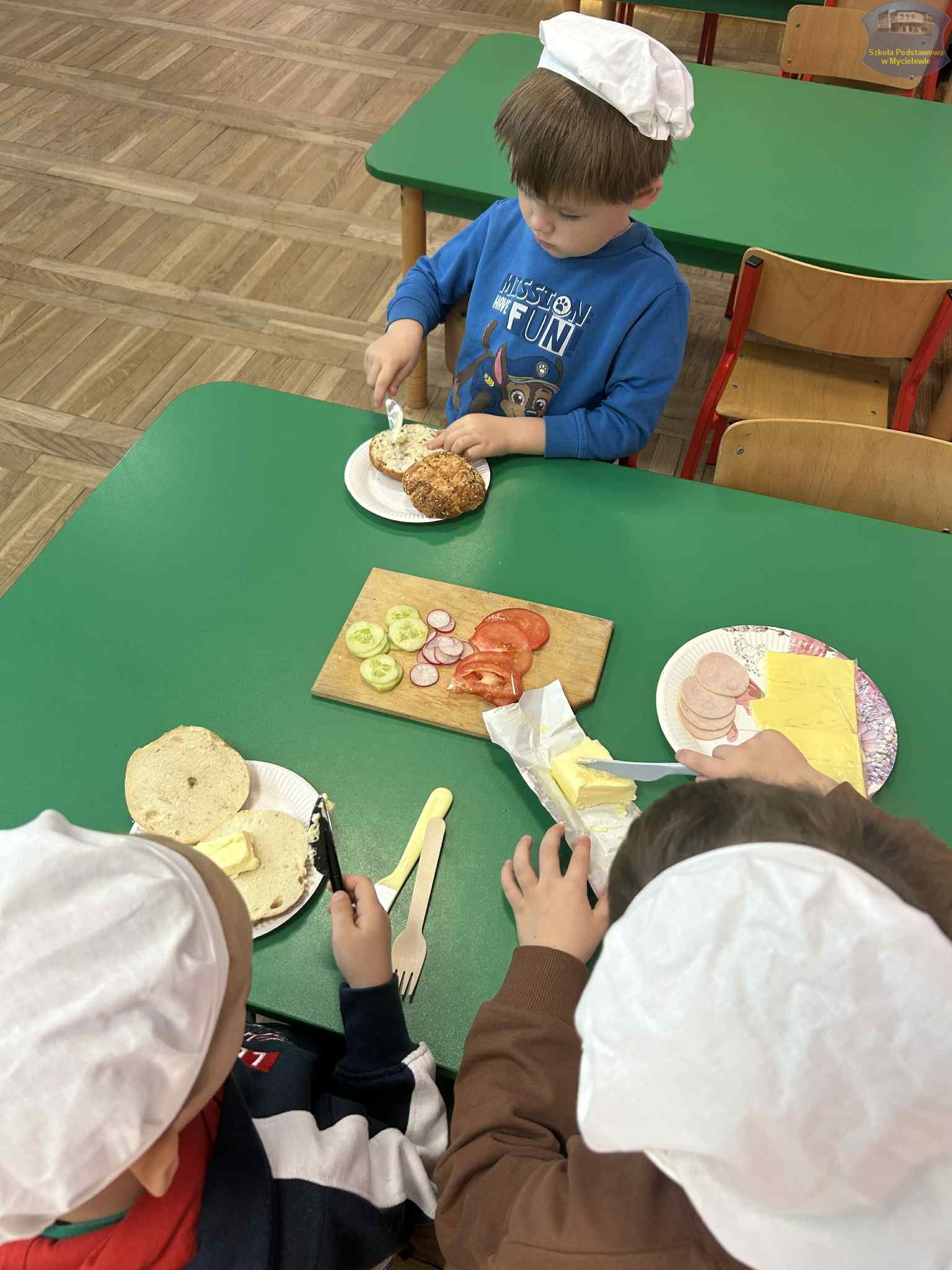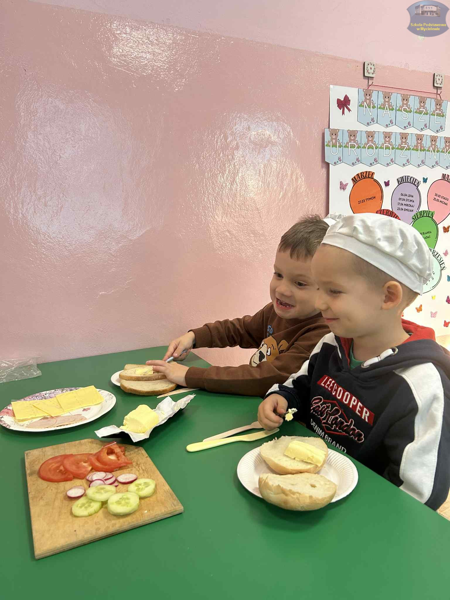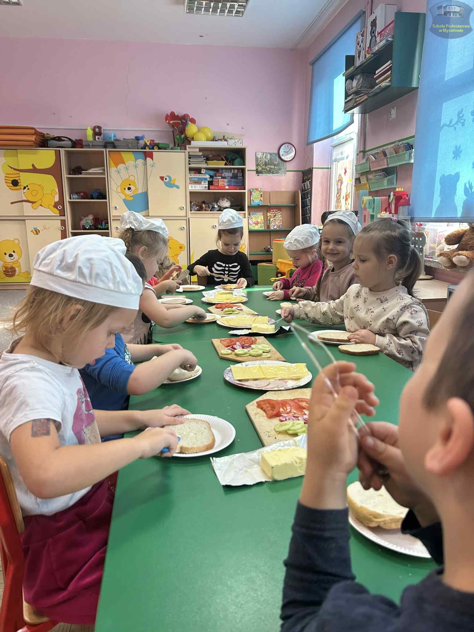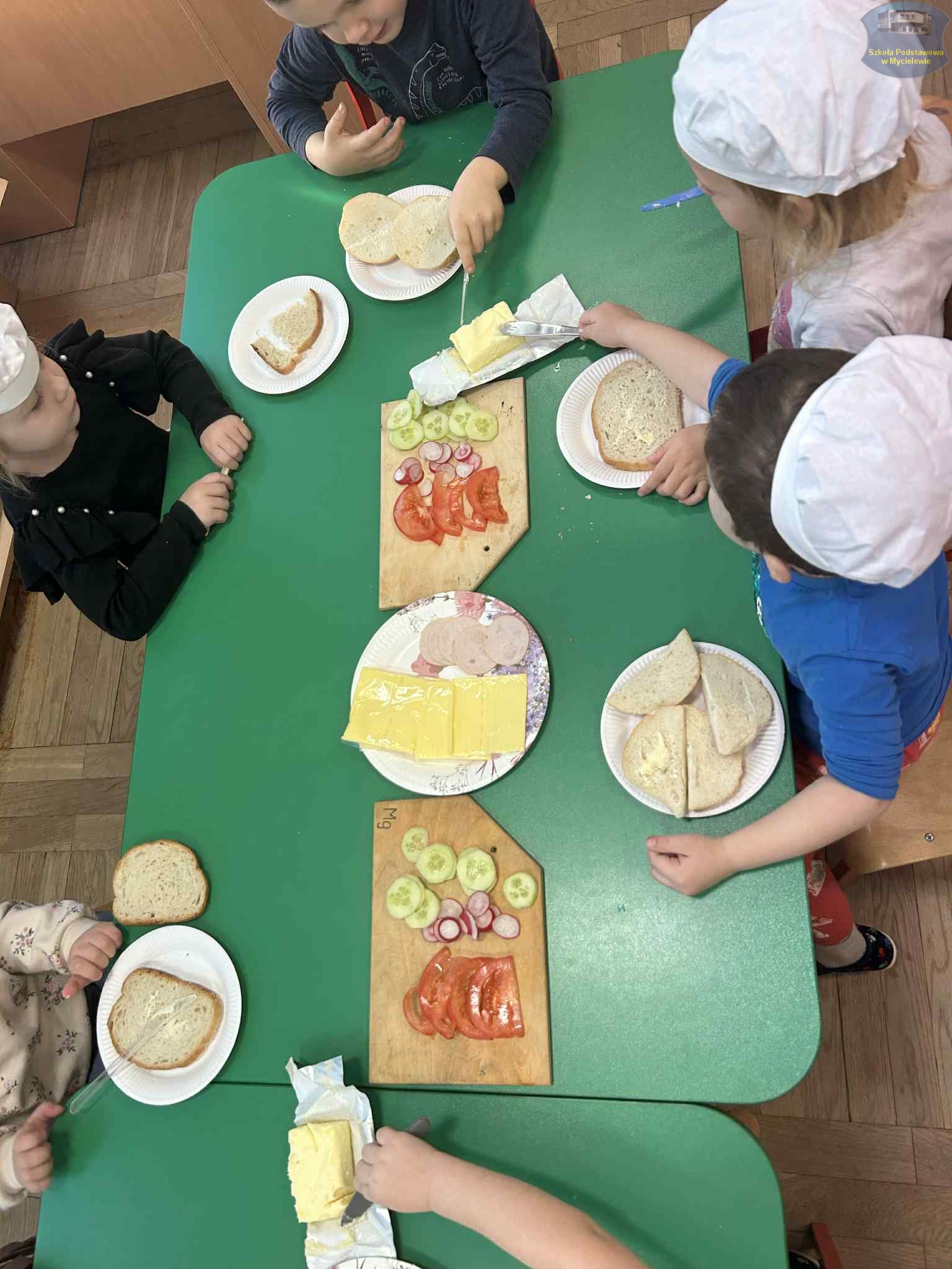 Dzień rozpoczął się od wspólnego przygotowywania zdrowych kanapek. Na stołach pojawiły się świeże warzywa: pomidory, ogórki, rzodkiewki, sałata, a także ser, chude wędliny i pełnoziarniste pieczywo. Przedszkolaki z zaangażowaniem komponowały swoje kanapki, tworząc prawdziwe, małe dzieła sztuki. Dzięki temu uczyły się, jak ważne jest korzystanie z różnorodnych i świeżych produktów.