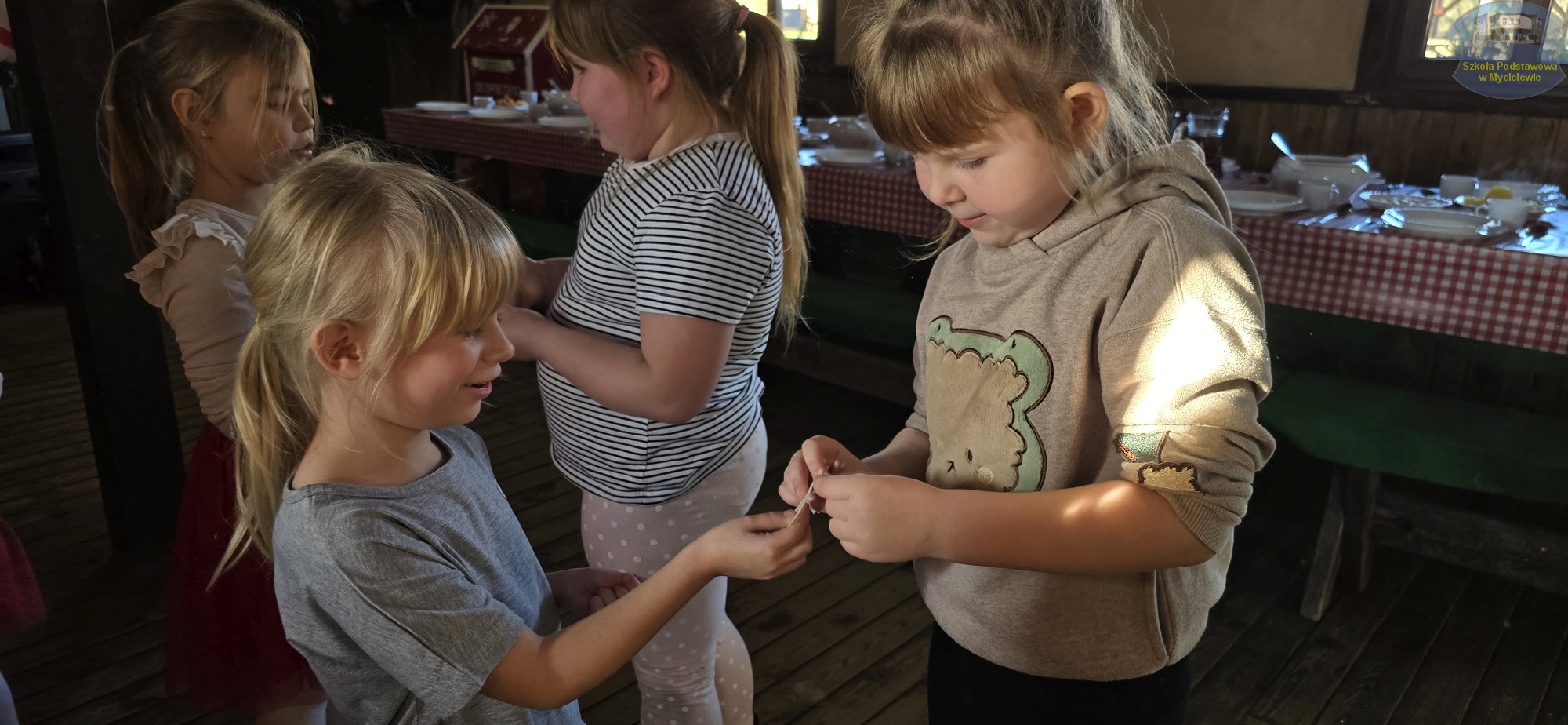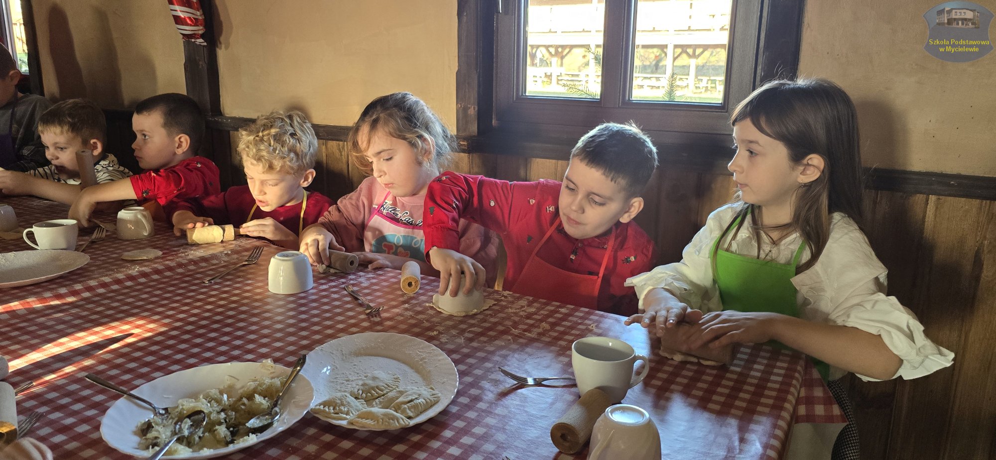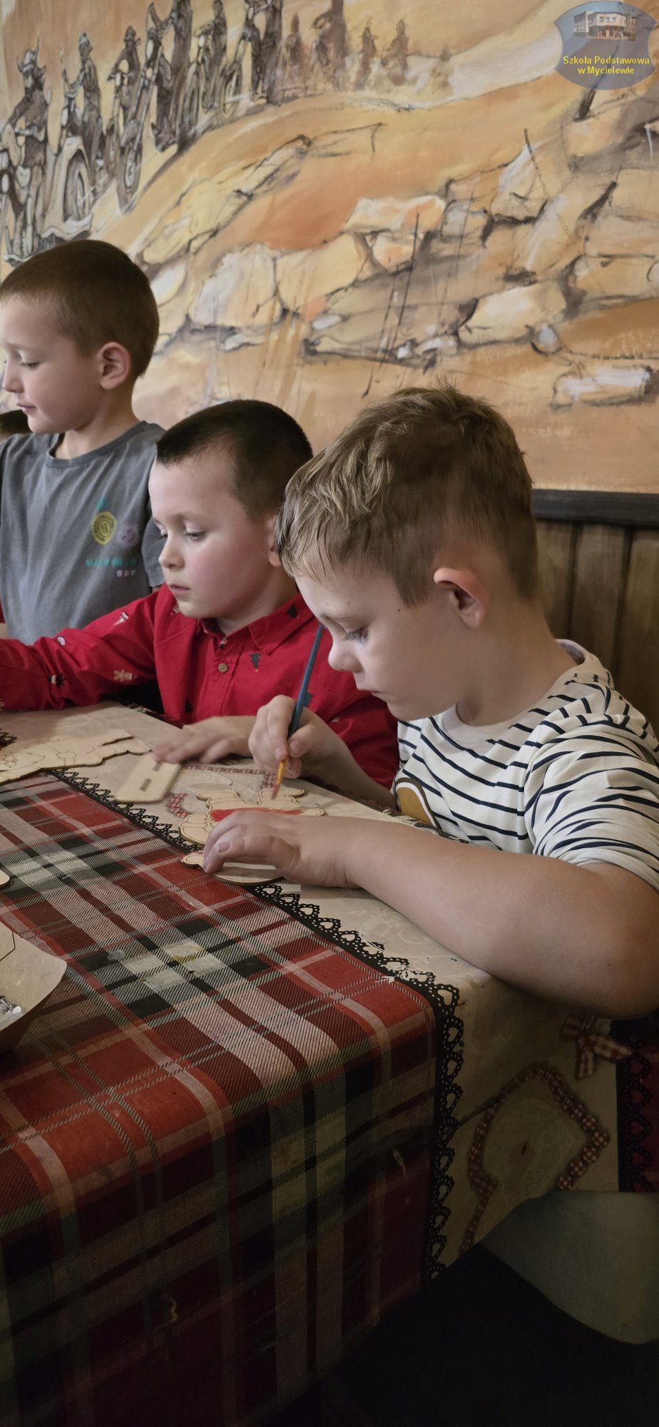 Przygoda trwała dalej w warsztatach kulinarnych, gdzie dzieci z radością wałkowały ciasto, nadziewały pierogi i z dumą podziwiały własne, smakowite dzieła. W pracowni artystycznej małe rączki tworzyły drewniane ozdoby, a dziecięca wyobraźnia przenosiła wszystkich do świata pełnego kolorów i fantazji.