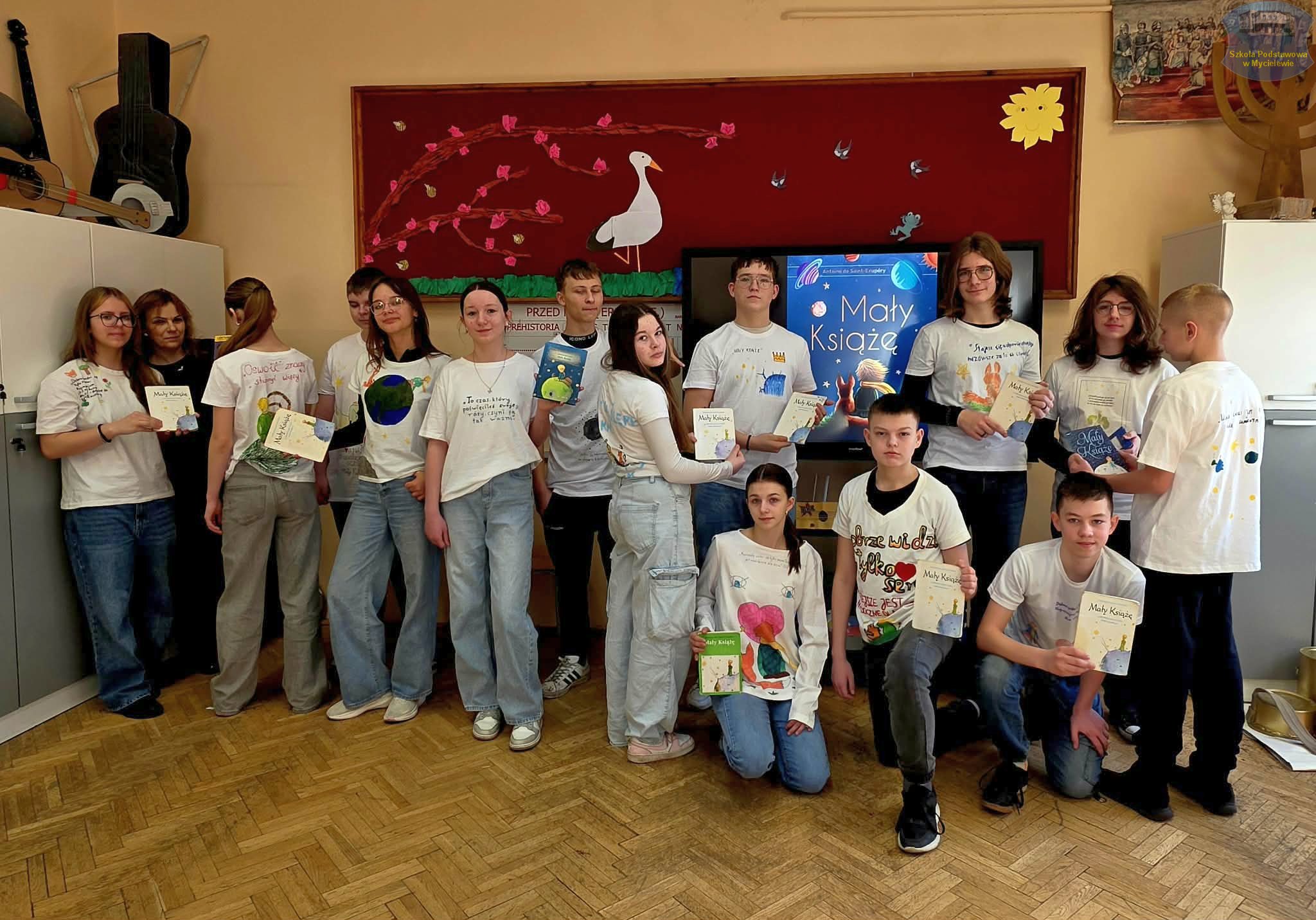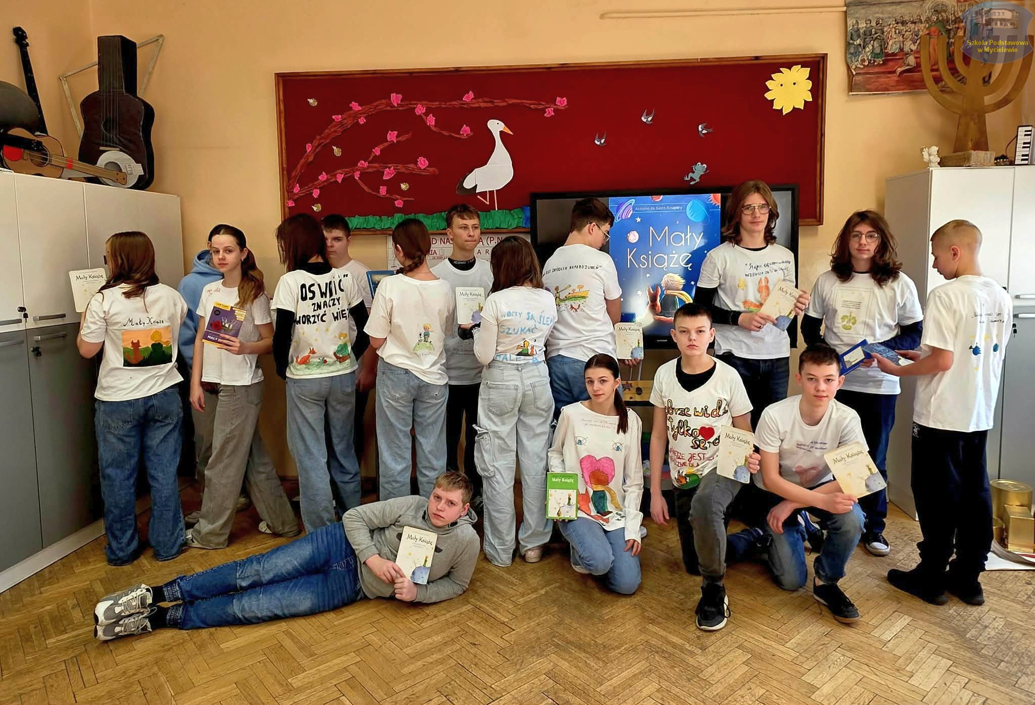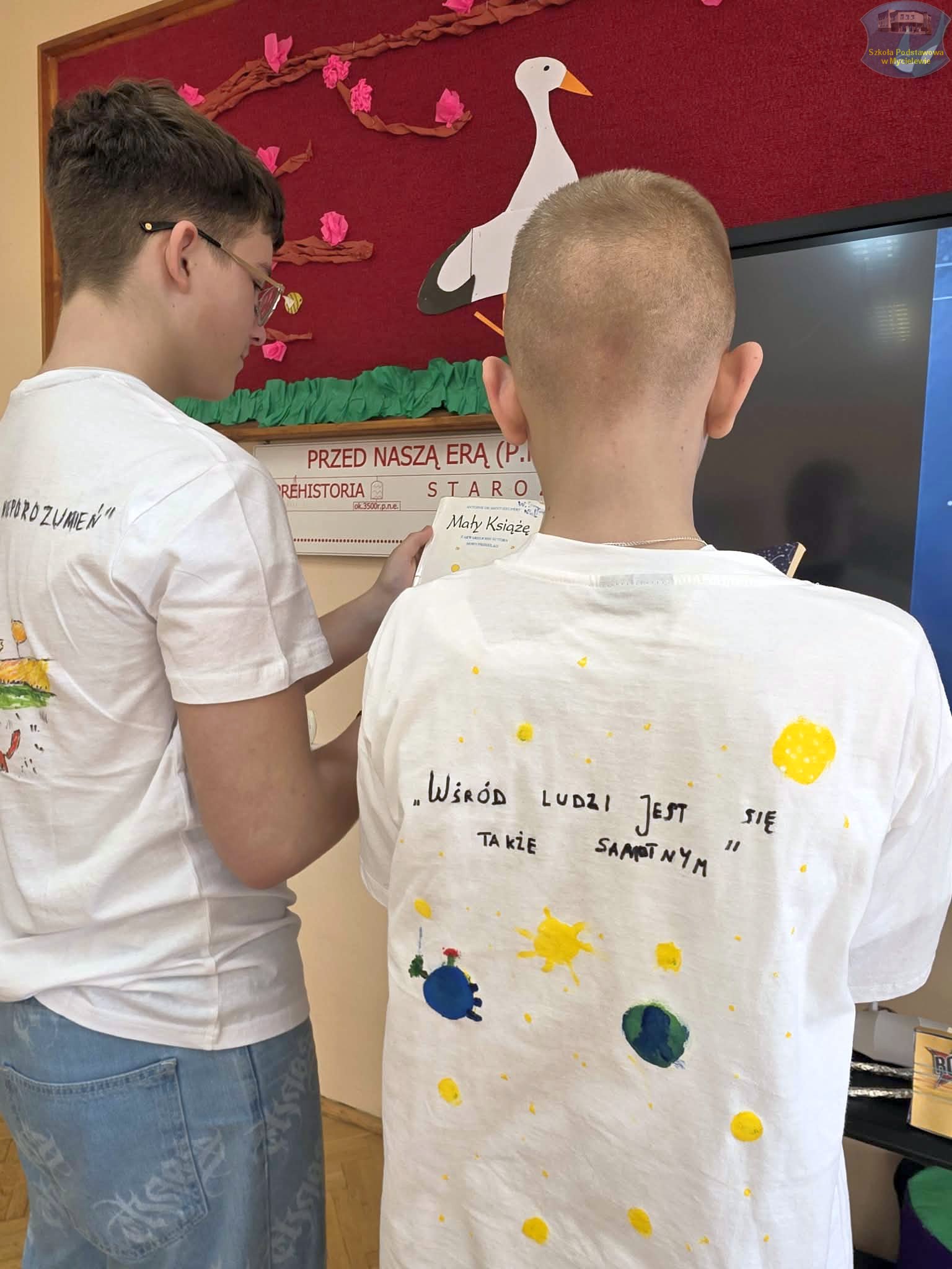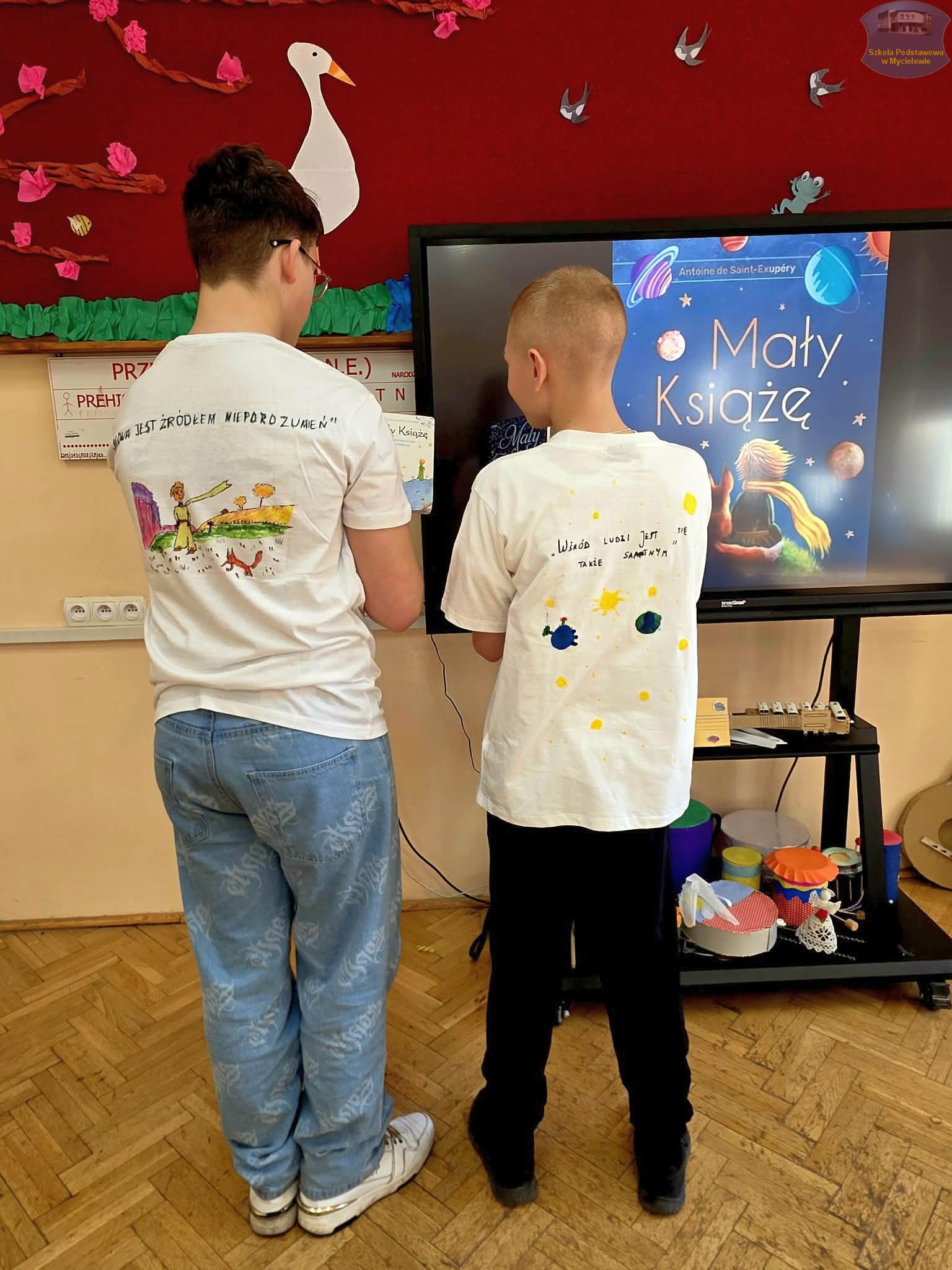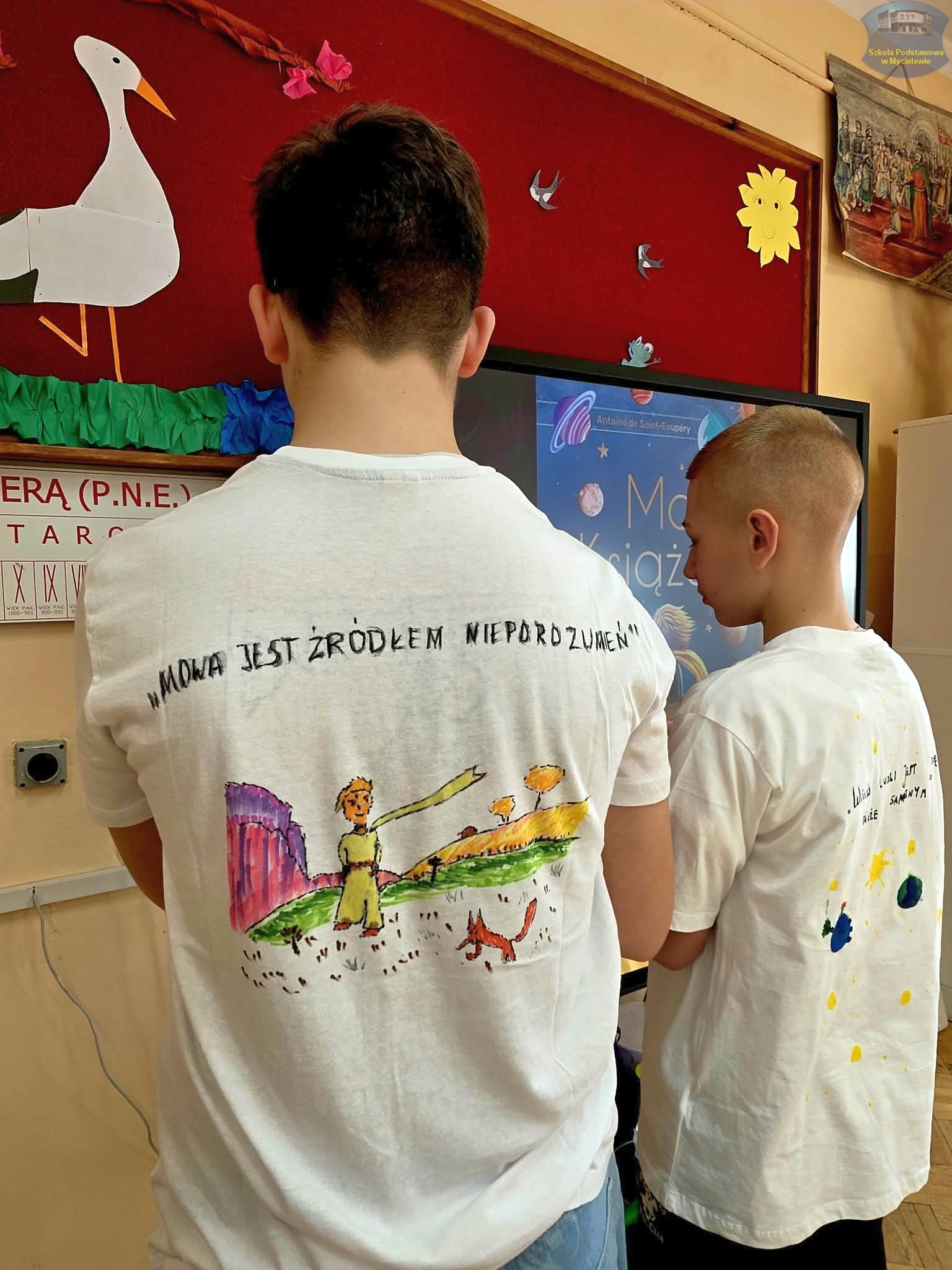 Uczniowie klasy VII podczas lekcji języka polskiego z panią A. Hak zorganizowali akcję „tworzenia więzów” z bohaterem lektury Antoine’a de Saint-Exupéry’ego – Małym Księciem. Siódmoklasiści własnoręcznie wykonali T-shirty z autorskimi ilustracjami oraz cytatami z książki, które niosą ponadczasowe wartości.