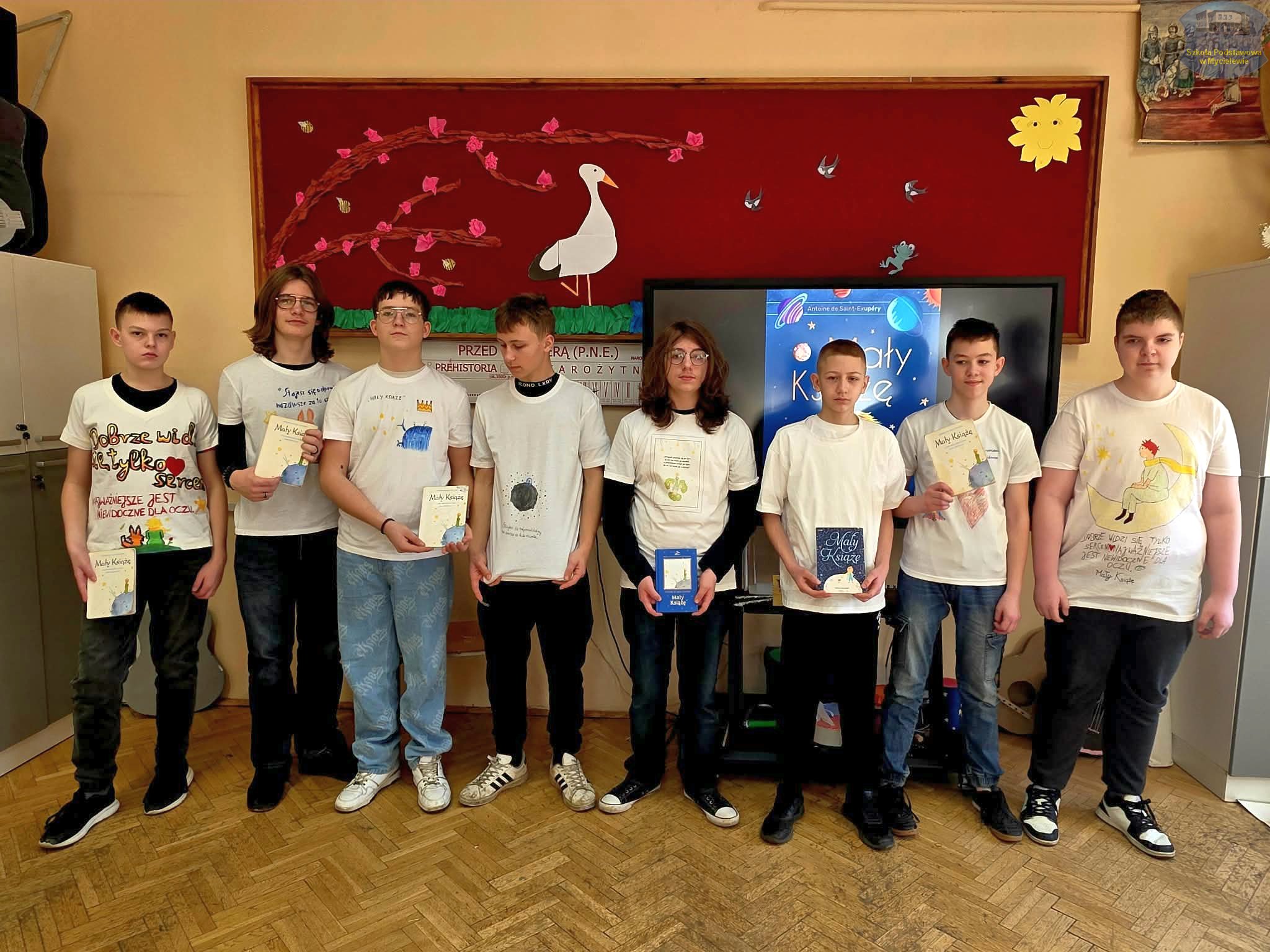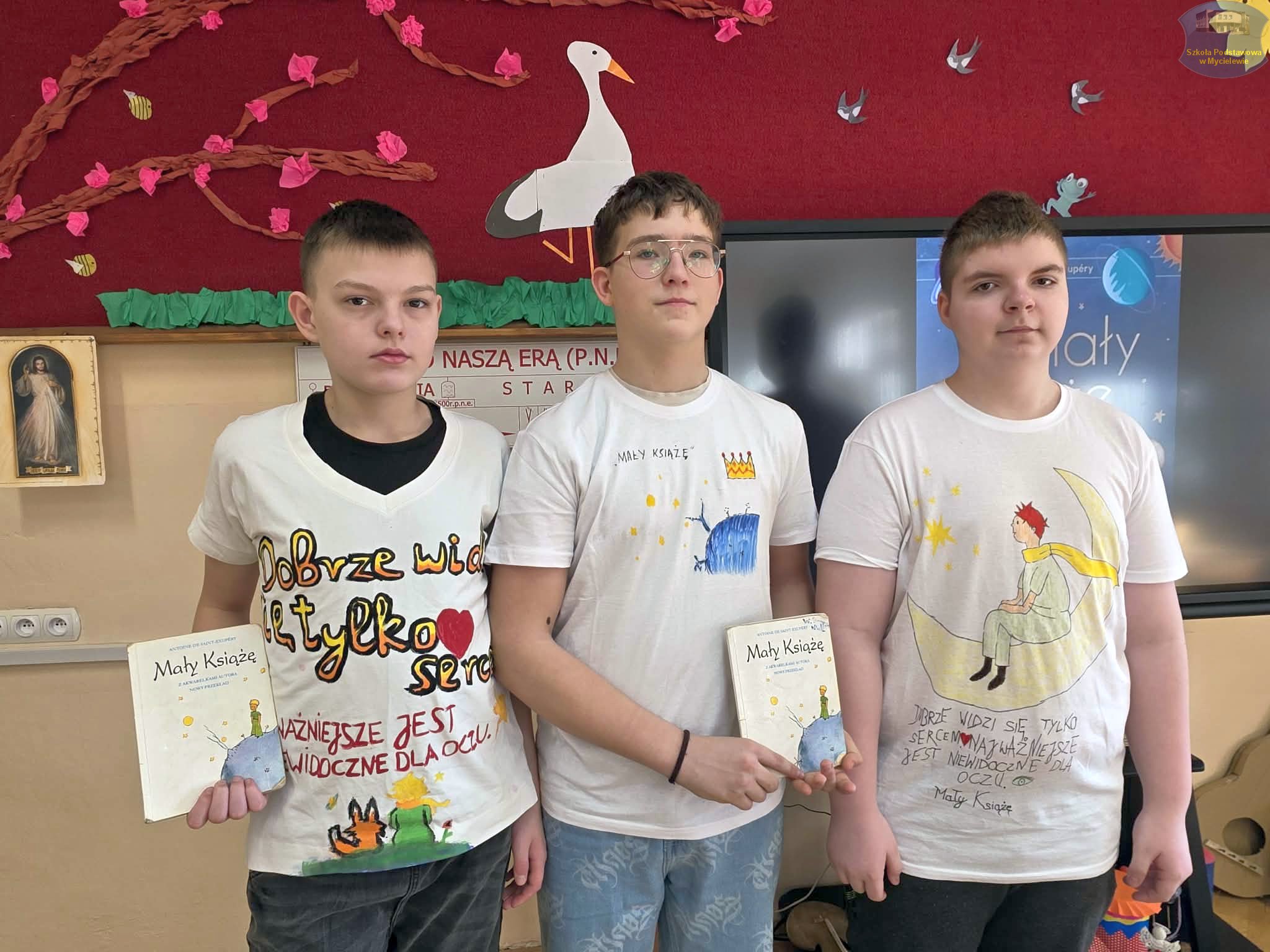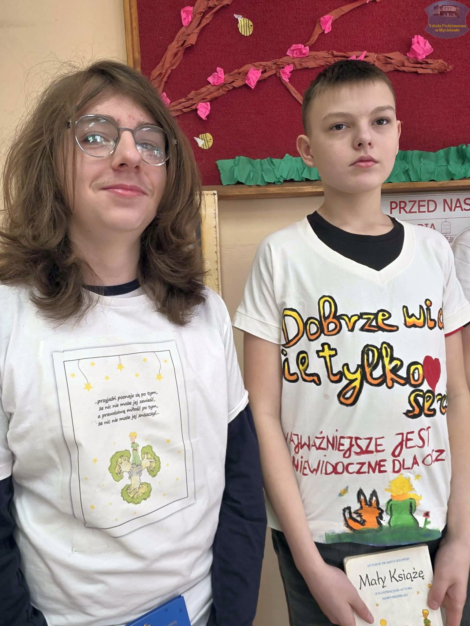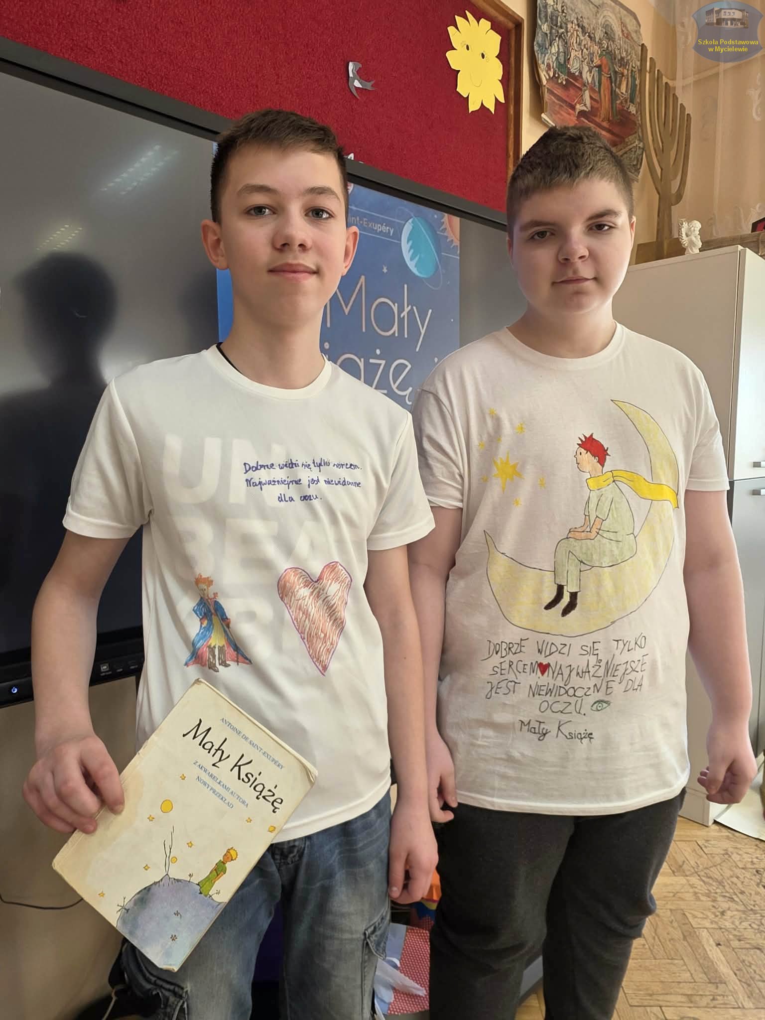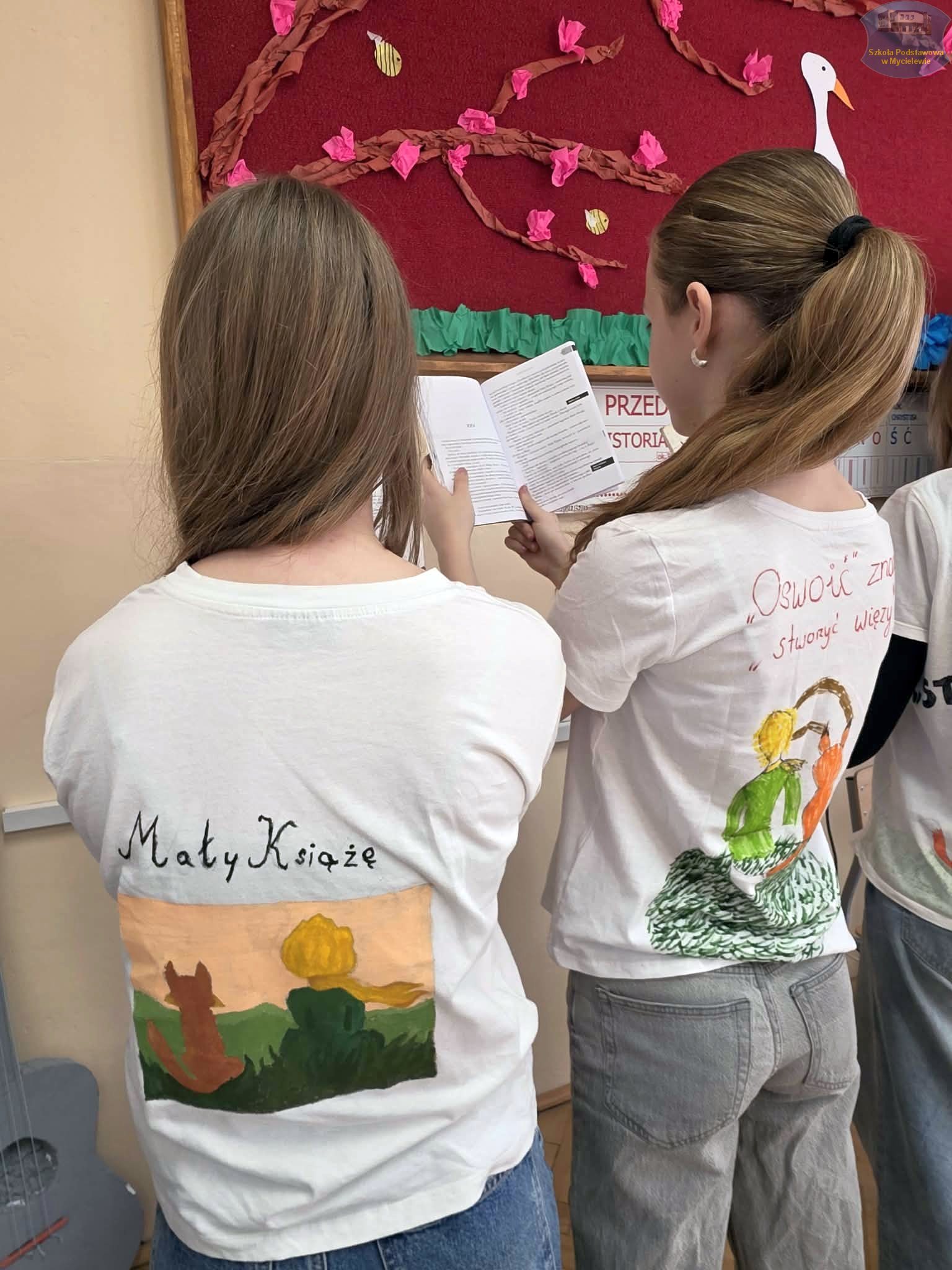 Uczniowie klasy VII podczas lekcji języka polskiego z panią A. Hak zorganizowali akcję „tworzenia więzów” z bohaterem lektury Antoine’a de Saint-Exupéry’ego – Małym Księciem. Siódmoklasiści własnoręcznie wykonali T-shirty z autorskimi ilustracjami oraz cytatami z książki, które niosą ponadczasowe wartości.