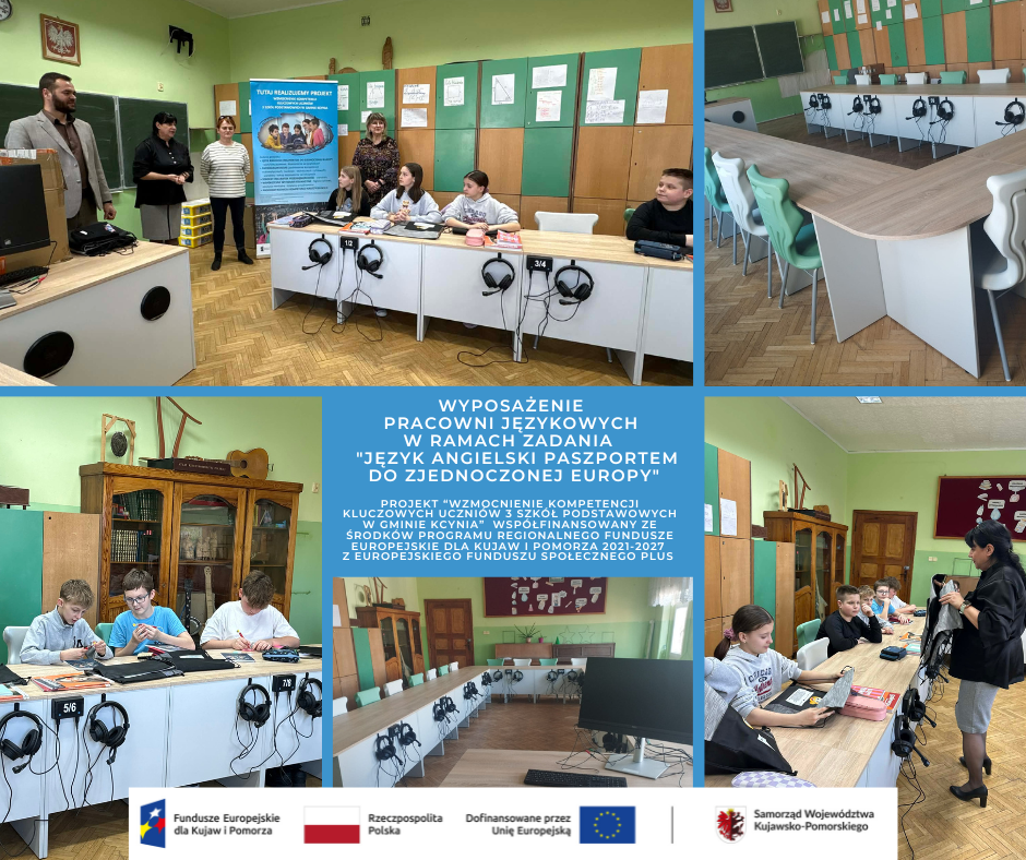 W ramach realizowanego przez Gminę Kcynia projektu pn. „Wzmocnienie kompetencji kluczowych uczniów 3 szkół podstawowych w Gminie Kcynia” wyposażono pracownie językowe do nauki języka angielskiego w trzech szkołach podstawowych: w Kcyni, Dziewierzewie i Mycielewie.