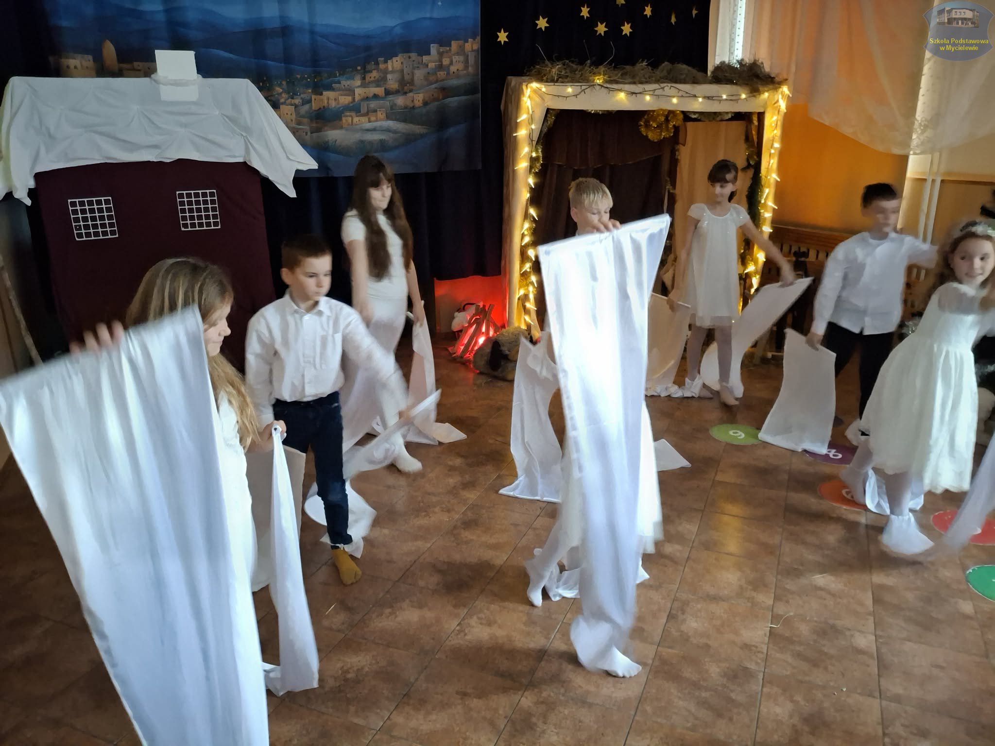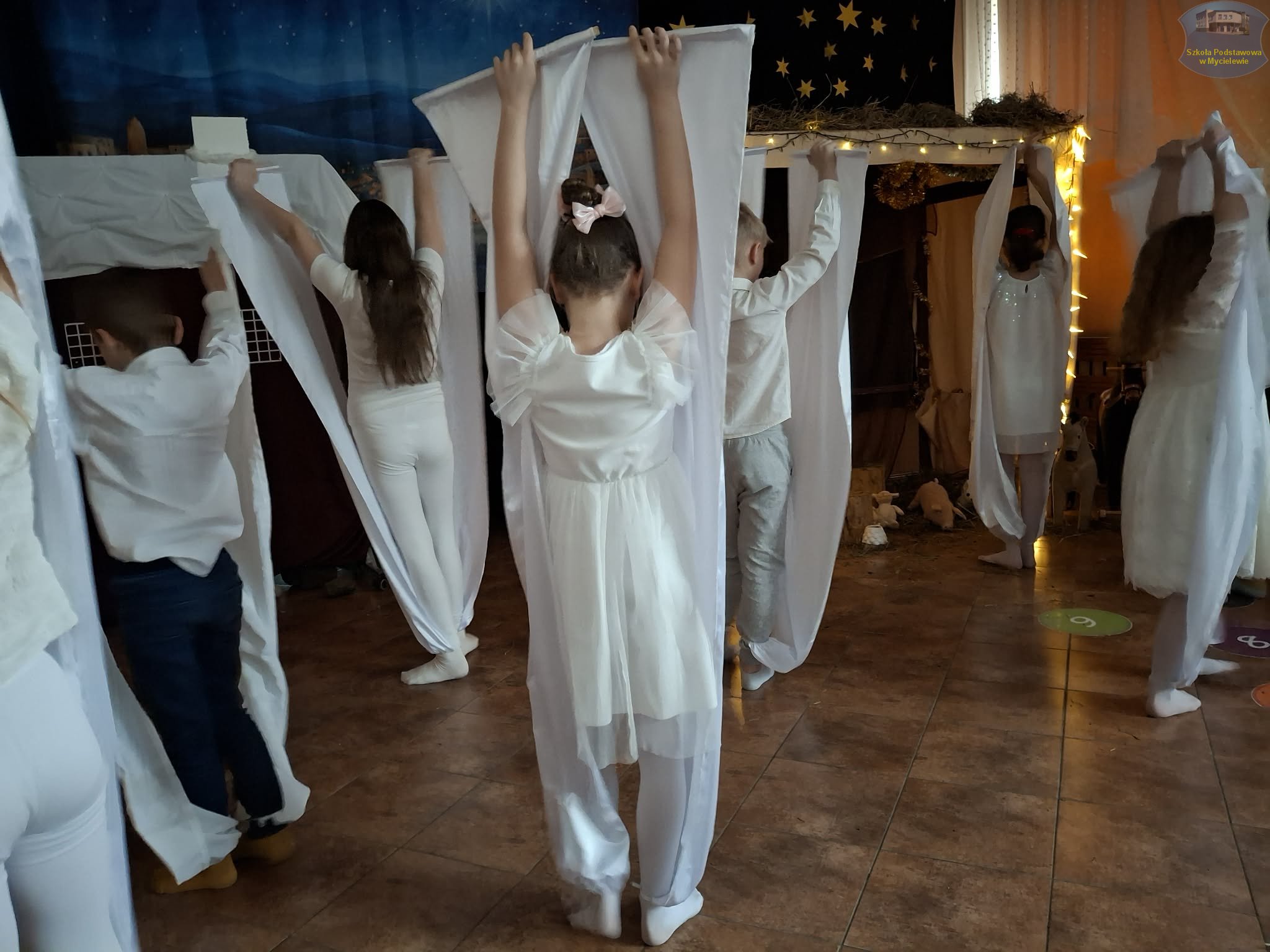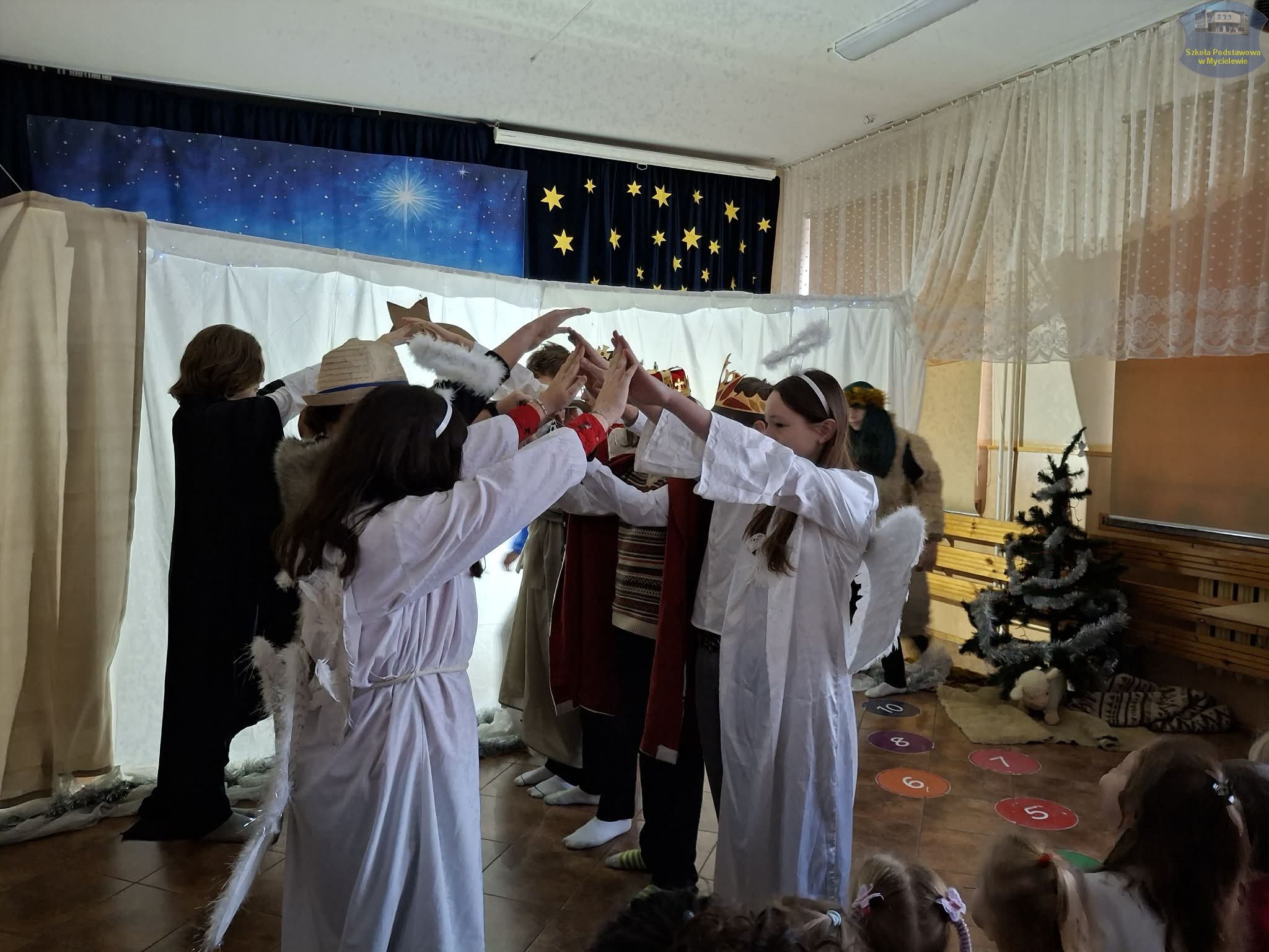 Pięknym uwieńczeniem jasełek był „Taniec Aniołów” do kolędy „Cicha noc” w wykonaniu uczniów klasy III, przygotowanych przez panią Beatę Mrotek. Delikatny ruch, muzyka i skupienie dzieci wywołały wiele wzruszeń wśród zgromadzonych gości.