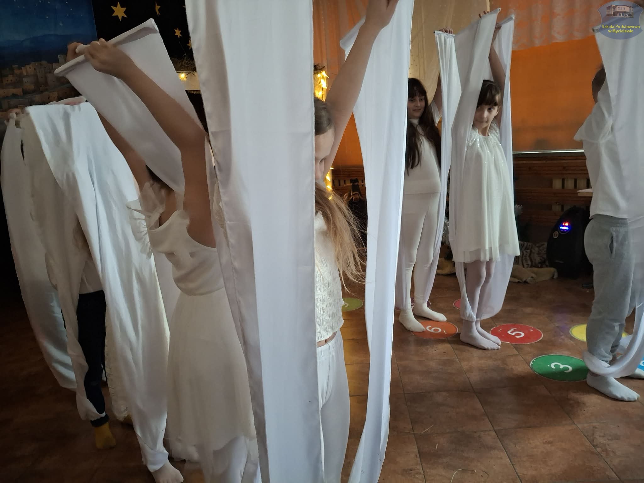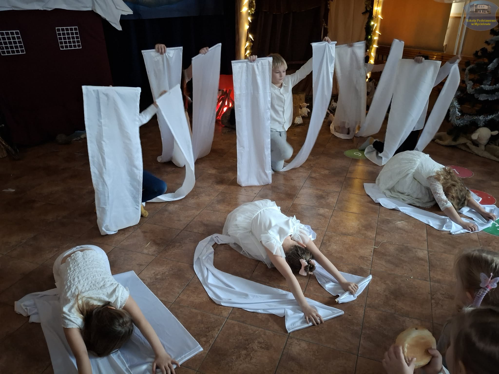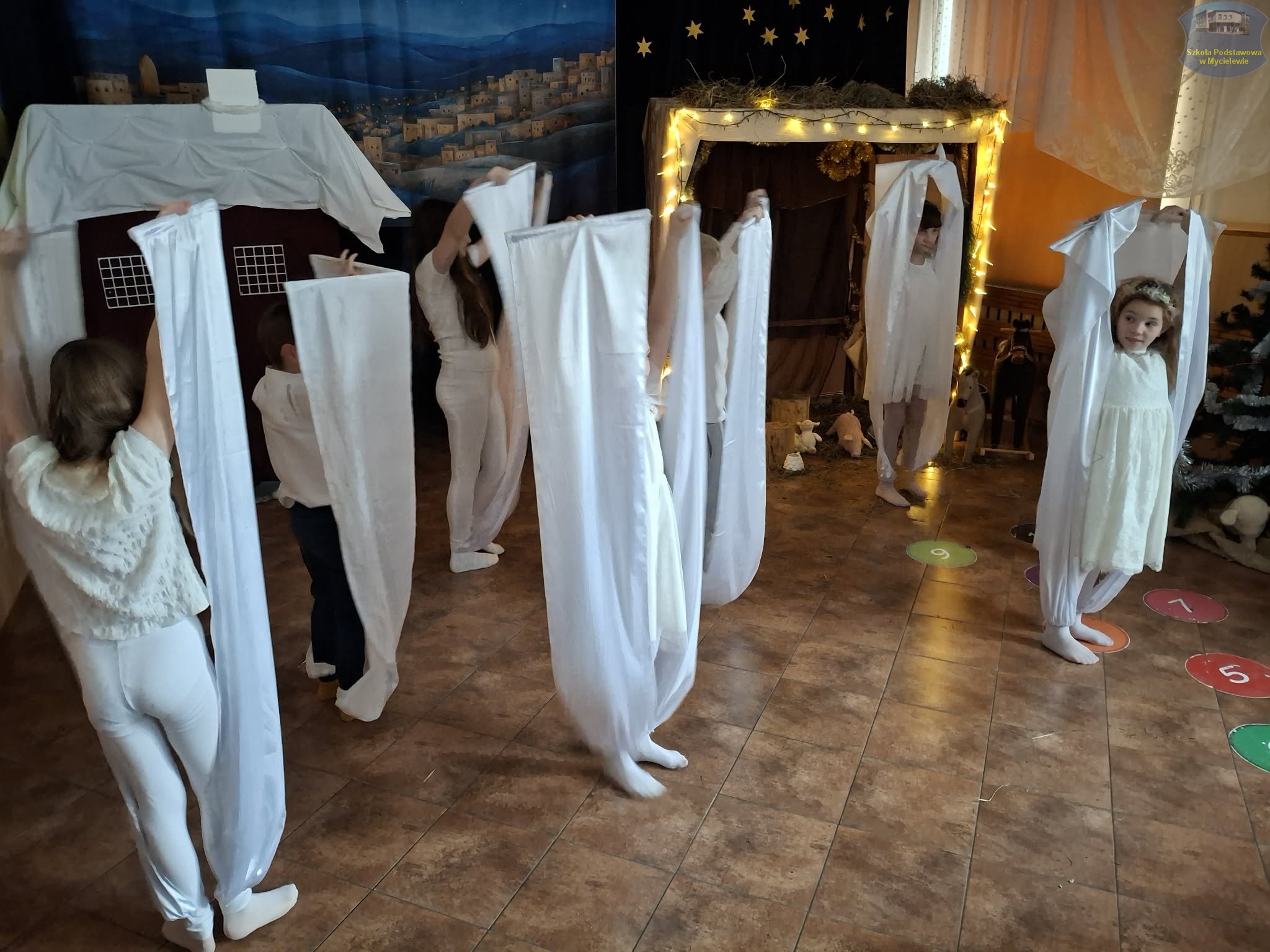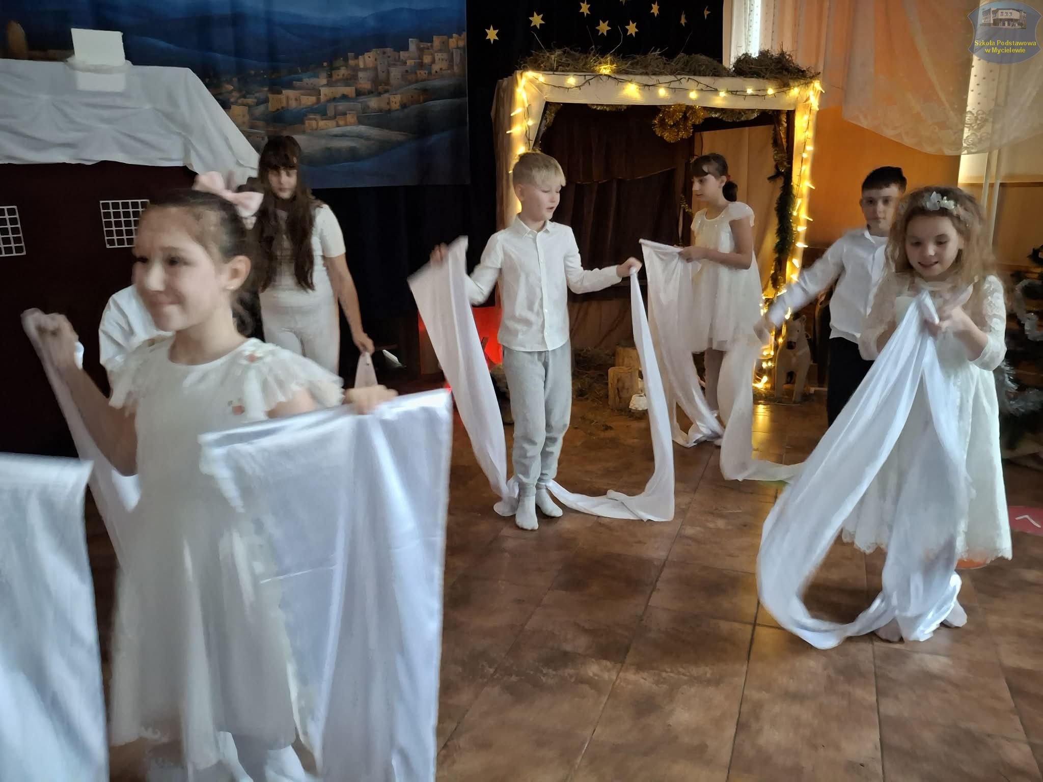 Pięknym uwieńczeniem jasełek był „Taniec Aniołów” do kolędy „Cicha noc” w wykonaniu uczniów klasy III, przygotowanych przez panią Beatę Mrotek. Delikatny ruch, muzyka i skupienie dzieci wywołały wiele wzruszeń wśród zgromadzonych gości.